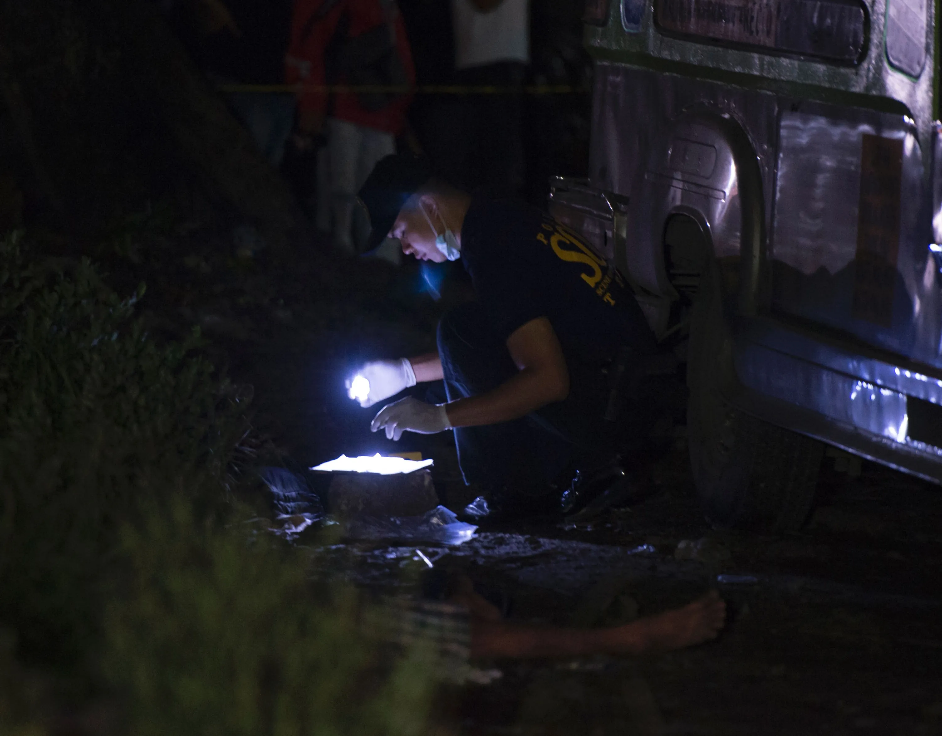 A member of police Scene of the Crime Operative (SOCO) look for evidence next to a dead suspected drug pusher killed during a drug buy-bust operation by police along a rail line in Caloocan City suburban Manila on early September 30, 2016. Philippine President Rodrigo Duterte on September 30 drew a parallel with his deadly crime war and Hitler's massacre of Jews, as he said he was “happy to slaughter” millions of drug addicts. (Photo by Ted Aljibe/AFP Photo)