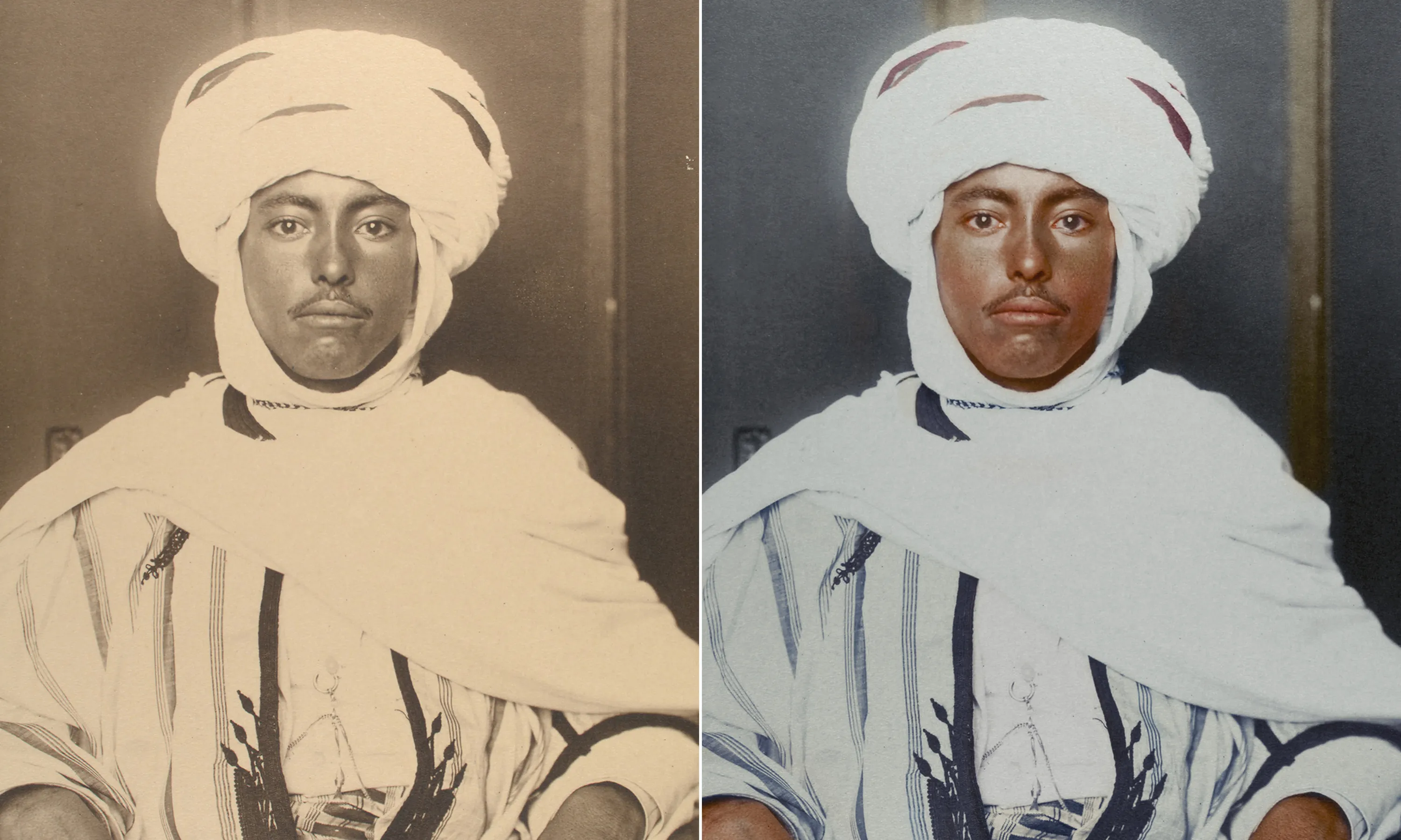 An Algerian man circa 1910 wearing a kaftan tunic and a kufiya, which is a square of fabric folded into a triangle and held upon the head by a circlet of camel hair. (Photo by Augustus Francis Sherman/New York Public Library/The Guardian)