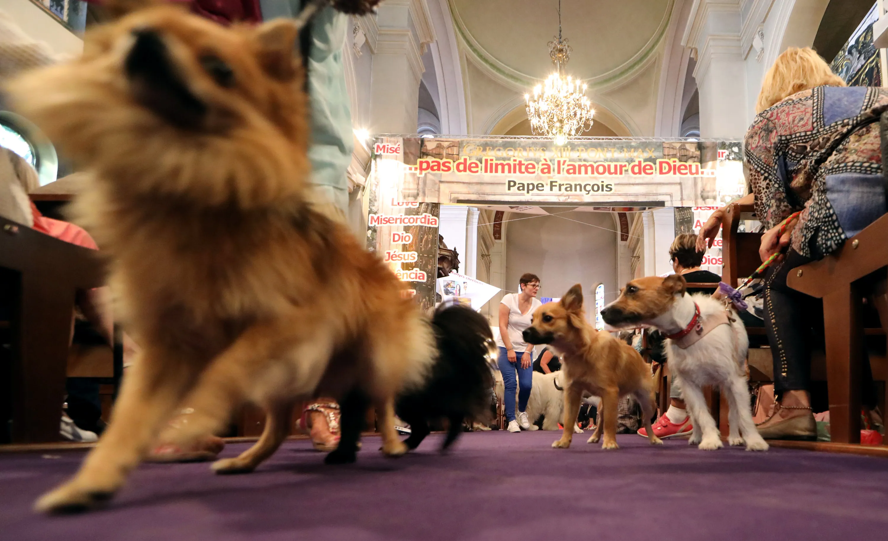 Pet owners attend a mass with their pets at the St Pierre D'Arene church to honour the feast of Saint Francis of Assisi, the patron saint of animals and the environment, in Nice, France October 2, 2016. (Photo by Eric Gaillard/Reuters)