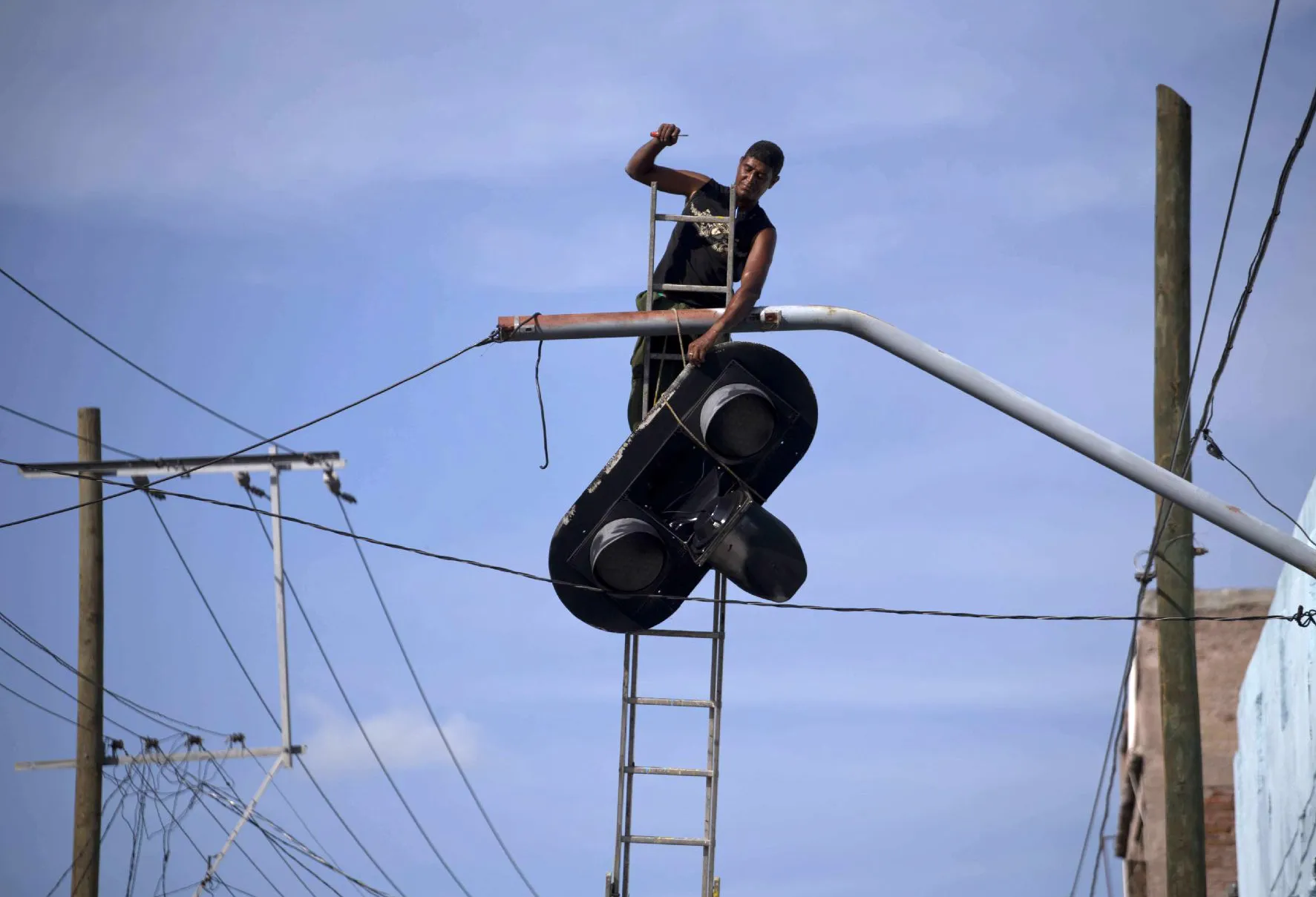 A worker dismantles a traffic light before the arrival of Hurricane Matthew in Santiago, Cuba on Sunday, October 2, 2016. Hurricane Mathew, one of the most powerful Atlantic hurricanes in recent history weakened a little on Saturday as it drenched coastal Colombia and roared across the Caribbean on a course that threatened Jamaica, Haiti and Cuba. (Photo by Ramon Espinosa/AP Photo)