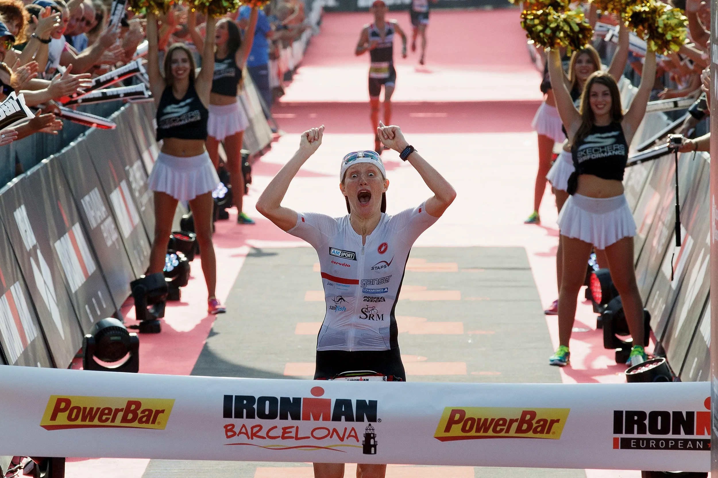 Athlete Astrid Stienen from Germany celebrates winning the women race during Ironman Barcelona on October 2, 2016 in Calella, near Barcelona, Spain. (Photo by Pablo Blazquez Dominguez/Getty Images)
