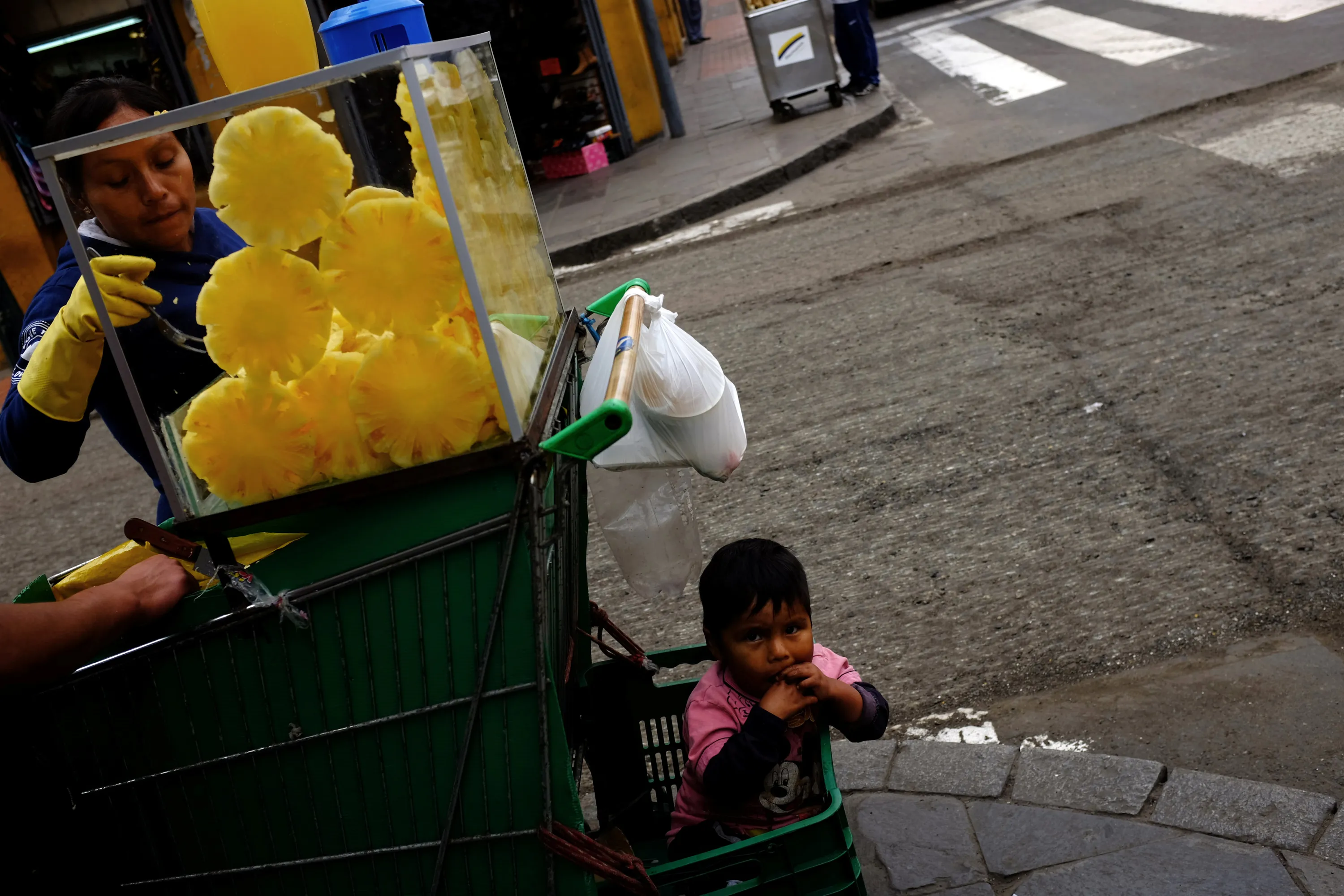 A street vendor, with her son, sells pineapples on a street in downtown Lima, Peru, September 24, 2016. (Photo by Nacho Doce/Reuters)