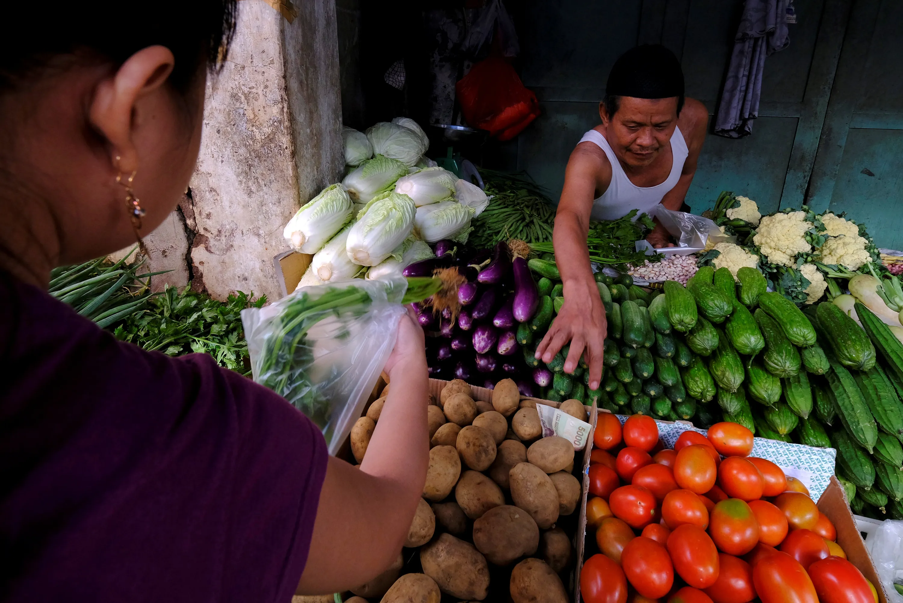 A vegetable vendor (R) takes money from customer at a morning market in Jakarta, Indonesia, October 3, 2016. (Photo by Reuters/Beawiharta)