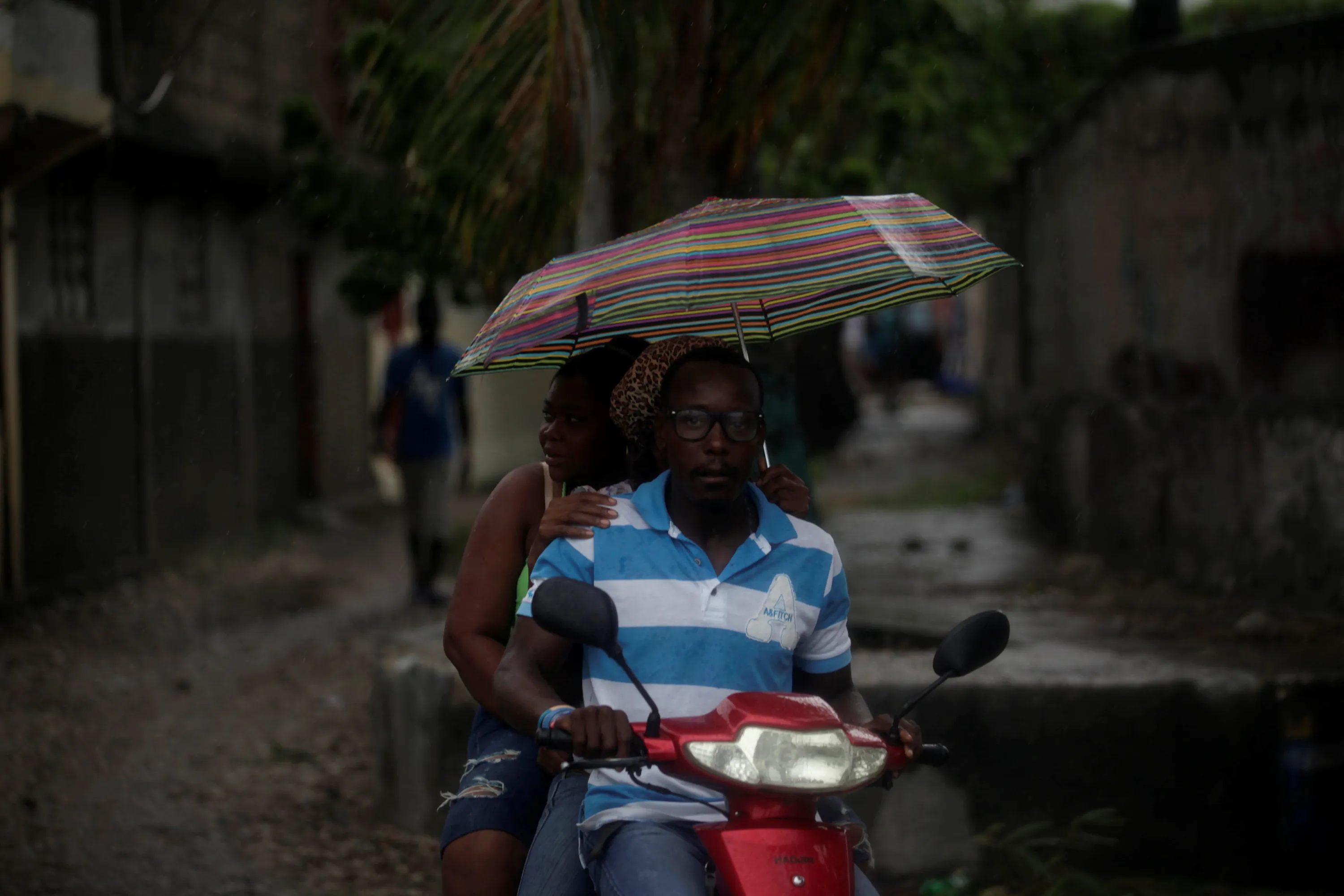 Three people protect themselves from rain with an umbrella as they ride a motorbike ahead of Hurricane Matthew in Les Cayes, Haiti, October 3, 2016. (Photo by Andres Martinez Casares/Reuters)