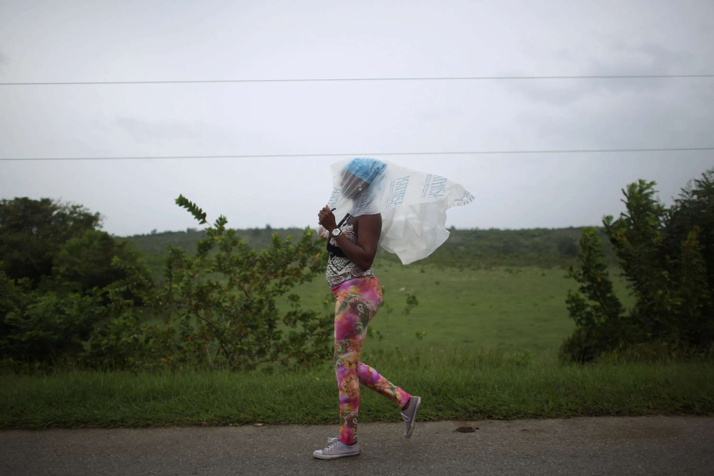 Naomi Rivera, 41, shields herself from the rain ahead of the arrival of Hurricane Matthew in Guantanamo, Cuba, October 4, 2016. (Photo by Alexandre Meneghini/Reuters)