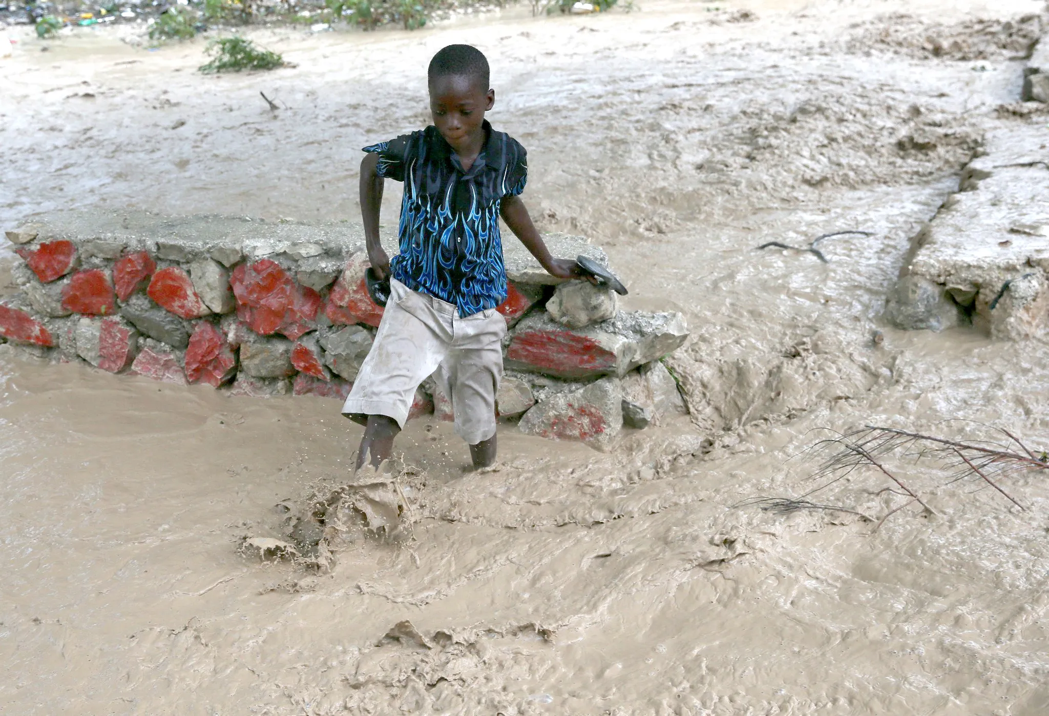 A Haitian boy walks along a flooded street in Fonds Parisiens, western Haiti, 04 October 2016. Hurricane Matthew made landfall on 04 October in western Haiti, causing mudslides and flooding, while two children were reported killed in neighboring Dominican Republic when their family's house collapsed in the heavy rains from the storm. (Photo by Orlando Barria/EPA)