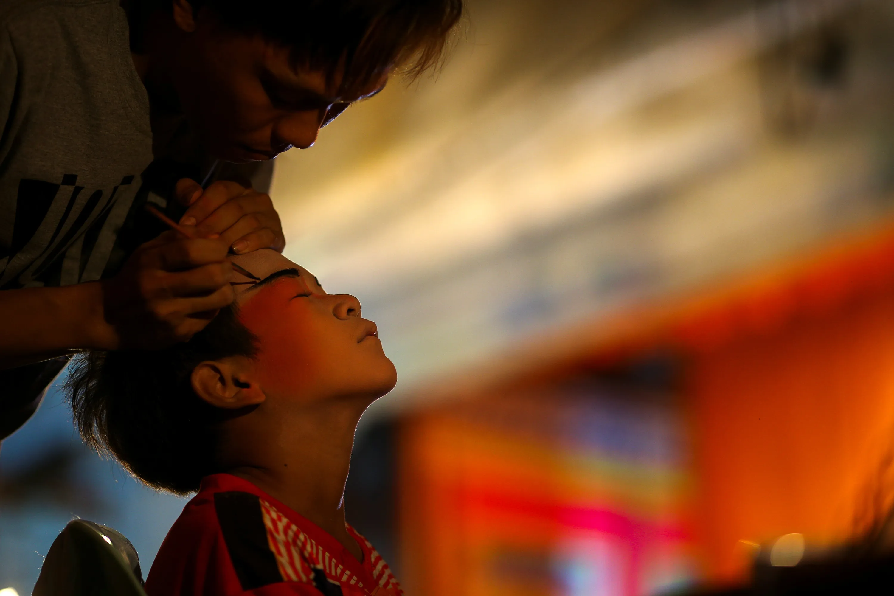 A member of a Chinese opera troupe applies make-up before performing at a shrine during the annual vegetarian festival in Bangkok, Thailand. October 4, 2016. (Photo by Athit Perawongmetha/Reuters)