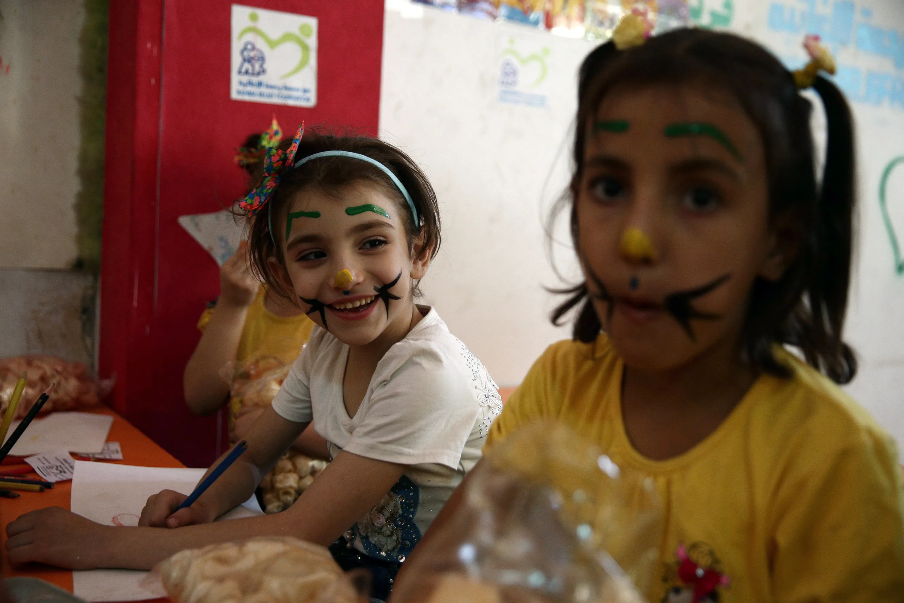 Girls attend a party for children affected by the Syrian conflict and in need for psychological support, in the rebel held besieged town of Hamouriyeh, eastern Ghouta, near Damascus, Syria, September 29, 2016. (Photo by Bassam Khabieh/Reuters)