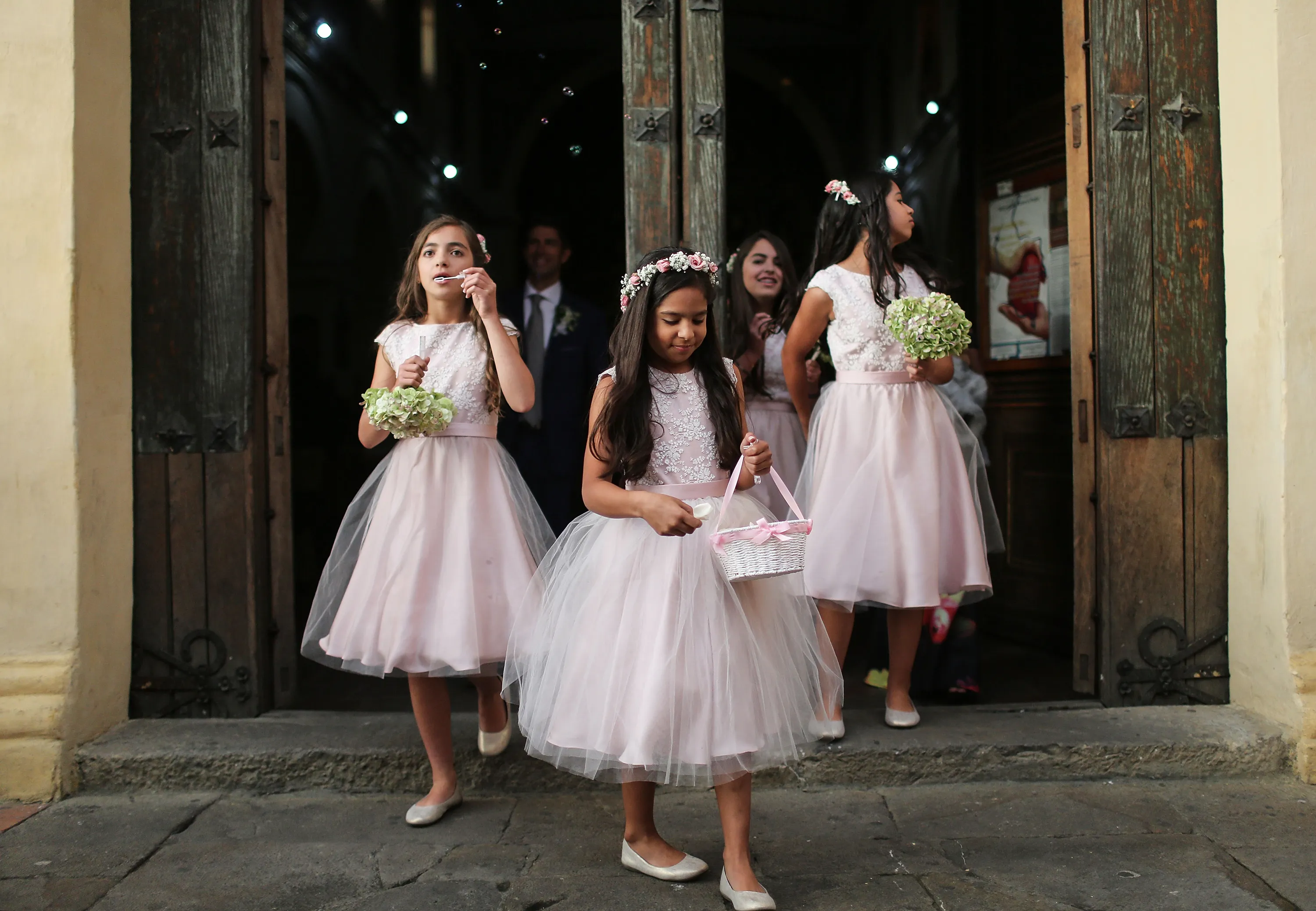 A flower girl blows bubbles as the wedding party departs a historic church following the marriage ceremony October 1, 2016 in Bogota, Colombia. Colombians will cast their ballots on October 2 in a final referendum on a peace accord to end the 52-year-old guerrilla war between the FARC and the state, the longest-running armed conflict in the Americas which has left 220,000 dead. The plan calls for a disarmament and re-integration of most of the estimated 7,000 FARC fighters. (Photo by Mario Tama/Getty Images)