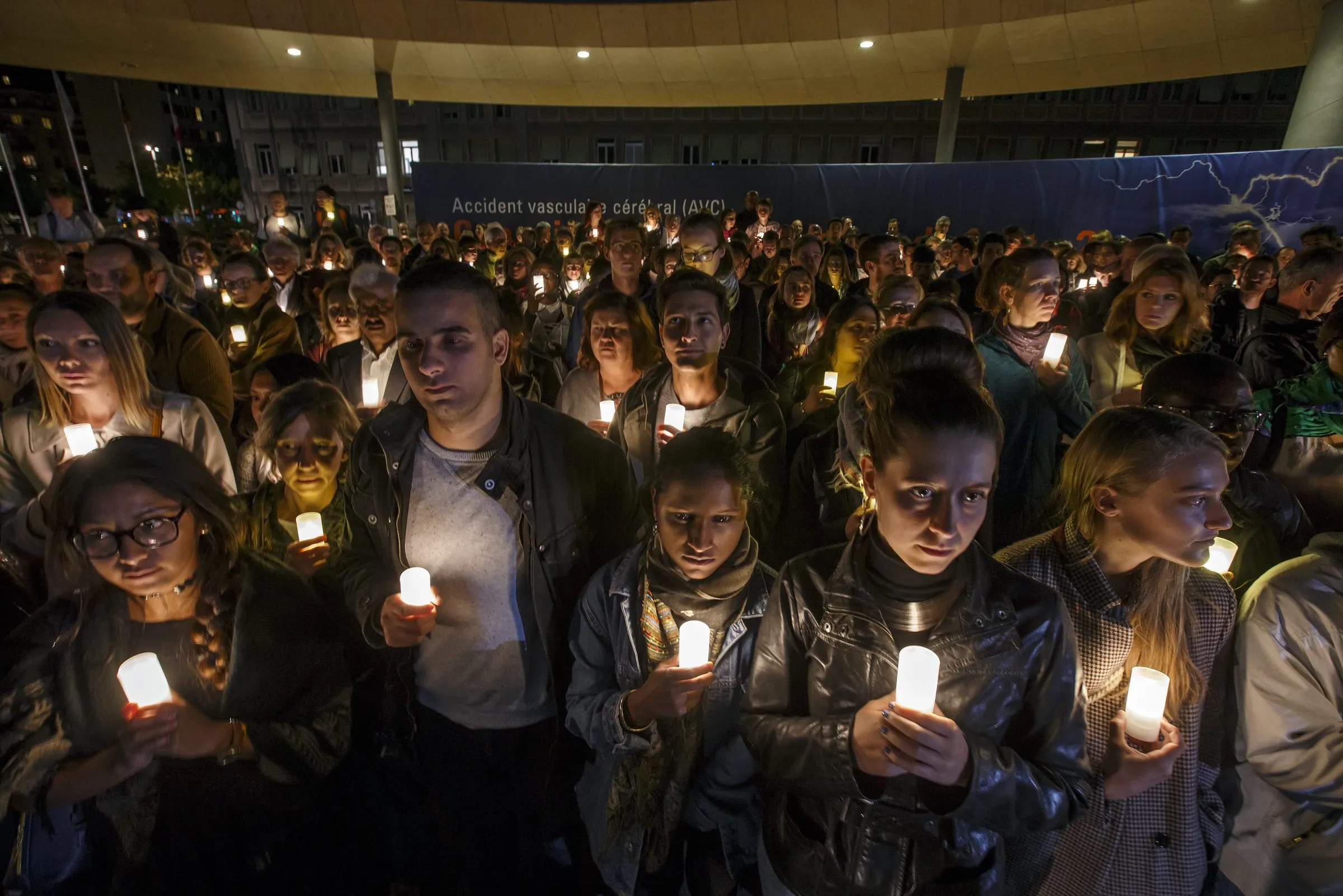 Participants and staff MSF (Medecins Sans Frontieres) hold lights during a commemoration for the victims of the US attack on the Kunduz hospital in Afghanistan, at the Geneva University Hospital (HUG) in Geneva, Switzerland, 03 October 2016. The Medecins Sans Frontieres, MSF, also known as Doctors Without Borders, launches the #NotATarget campaign so to increase the political costs of non-compliance of the laws of war and inform civil society of the non-compliance of unarmed populations in conflict zones. (Photo by Salvatore Di Nolfi/EPA)
