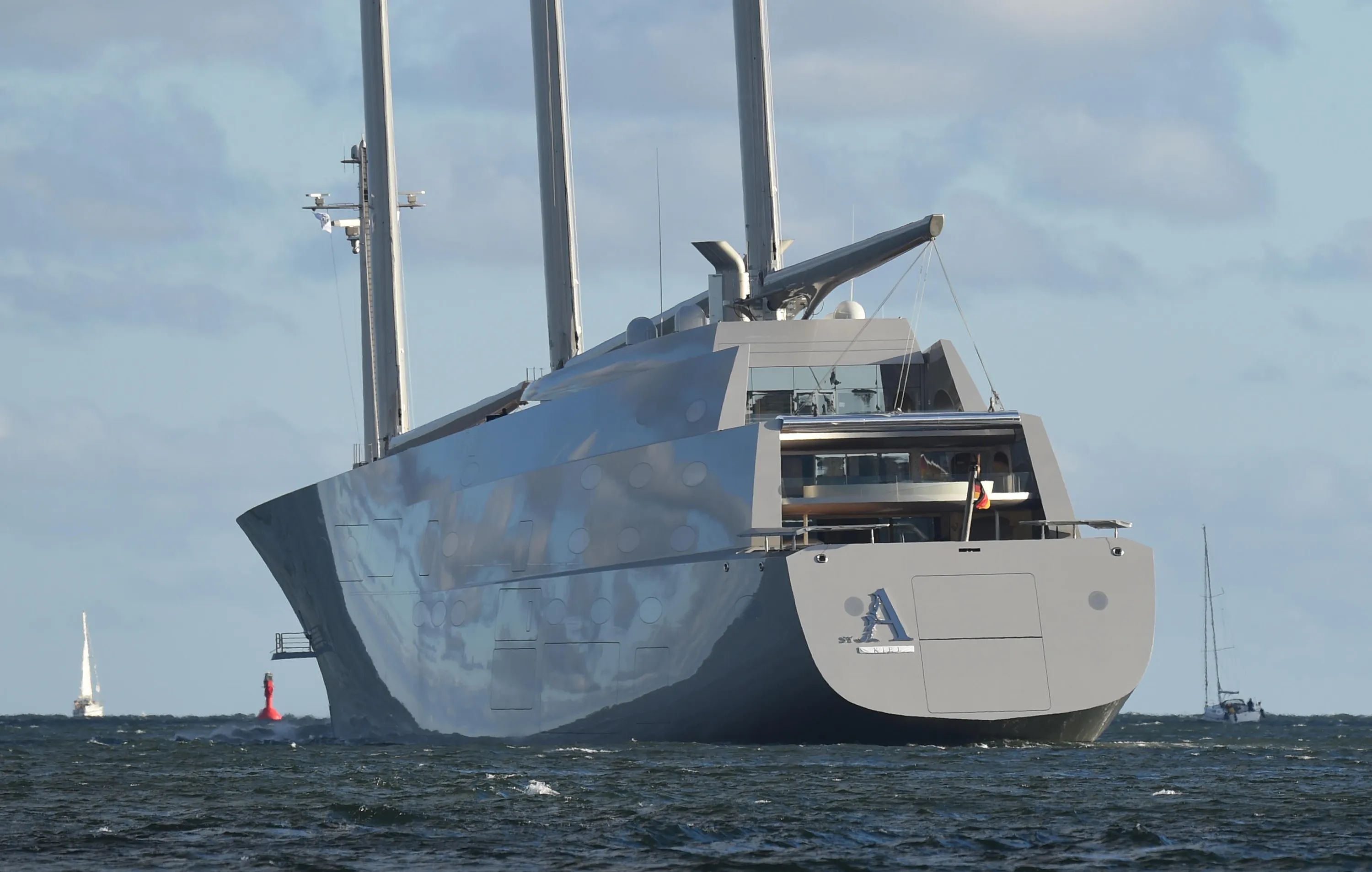 The 143-metre-long “Sailing Yacht A” leaves the harbour for a test run in Kiel, Germany, 4 October 2016. (Photo by Carsten Rehder/DPA/Alamy Live News)