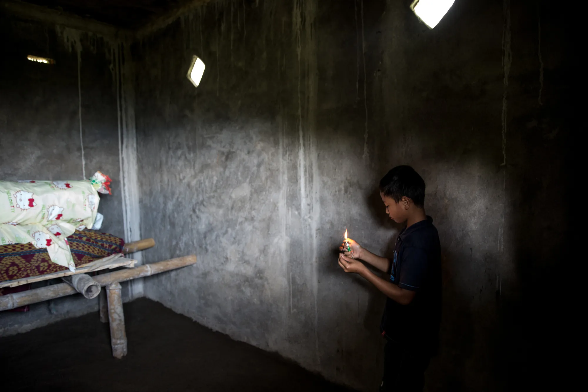 A boy lights incense in front of Lucas Payung's body before the Ma'Nene ritual in Barrupu Village, Toraja, South Sulawesi on August 16, 2016. (Photo by Agung Parameswara/The Washington Post)