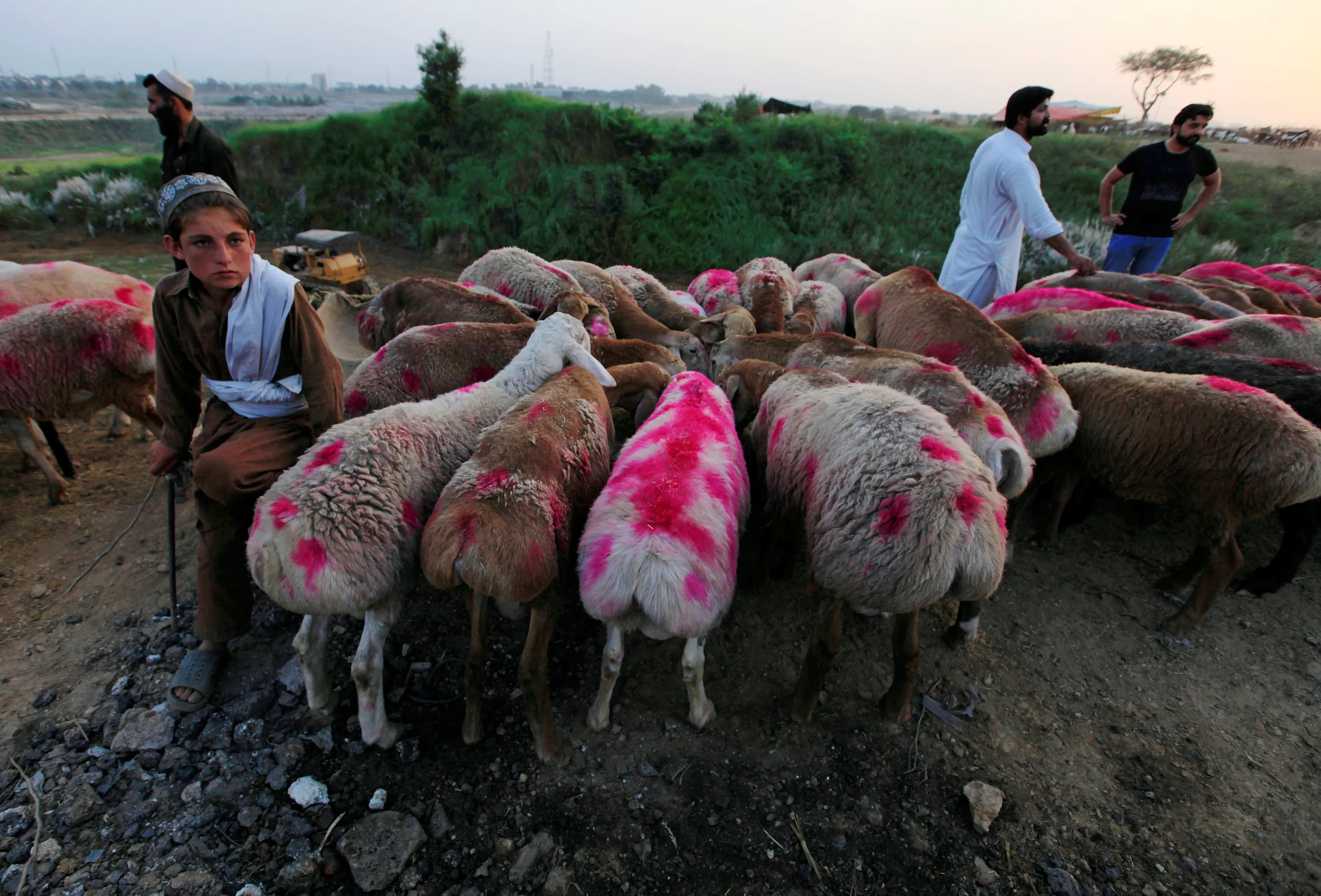 A boy with his sheep for sale waits for customers at a makeshift cattle market, ahead of the Eid al-Adha festival, in Islamabad, Pakistan September 7, 2016. (Photo by Faisal Mahmood/Reuters)