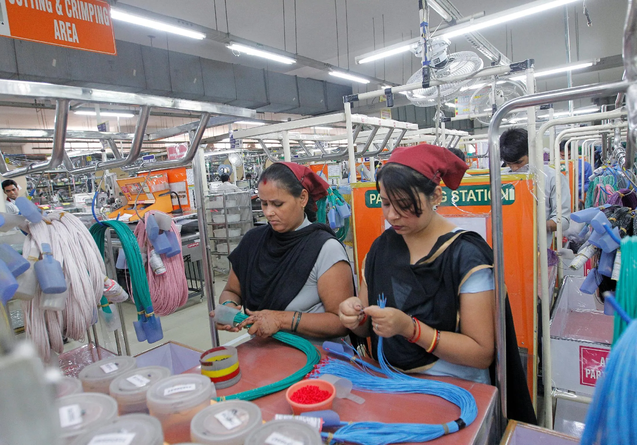 Employees of Motherson Sumi Systems Ltd, work on a car wiring assembly line inside a factory in Noida on the outskirts of New Delhi, India April 28, 2016. (Photo by Anindito Mukherjee/Reuters)
