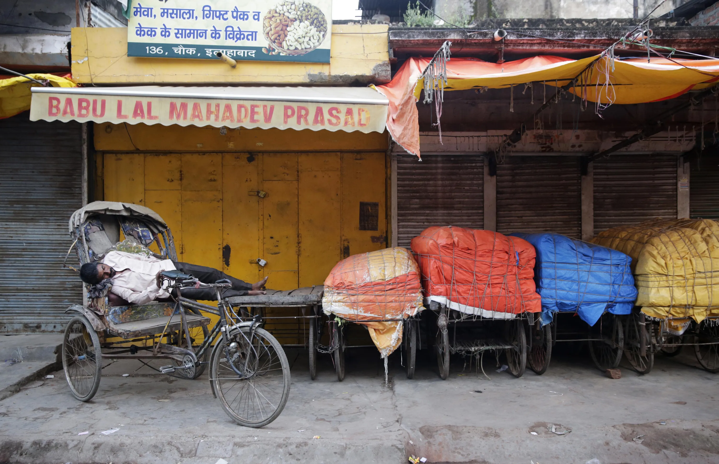 A rickshaw driver sleeps beside covered handcarts early morning in Allahabad, India, Tuesday, October 4, 2016. Some 800 million people in the country live in poverty, many of them migrating to big cities in search of a livelihood and often ending up on the streets. (Photo by Rajesh Kumar Singh/AP Photo)