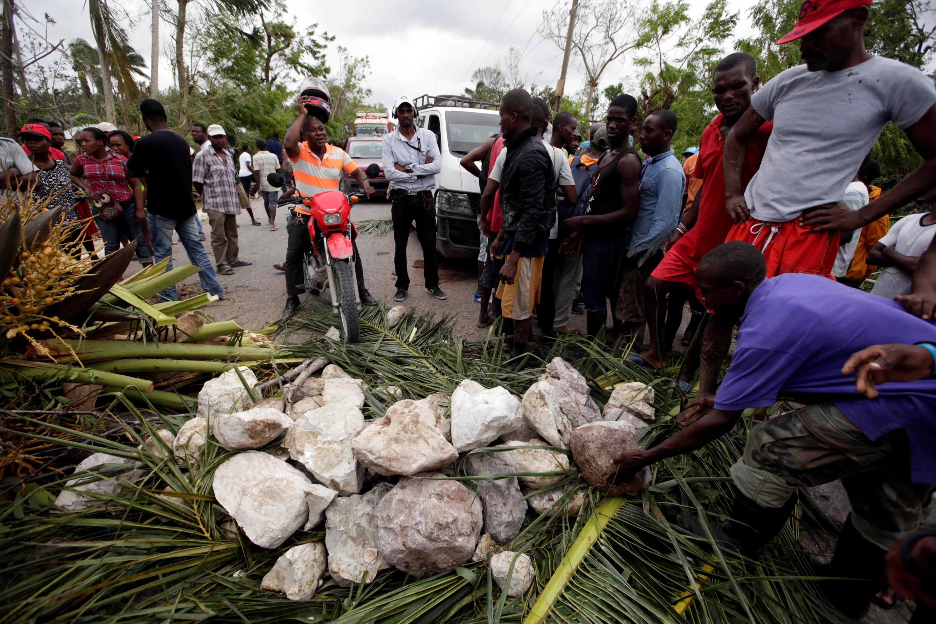 A man puts a rock on a barricade set up on the road to protest against the lack of assistance after Hurricane Matthew in Cavaillon, Haiti, October 6, 2016. (Photo by Andres Martinez Casares/Reuters)