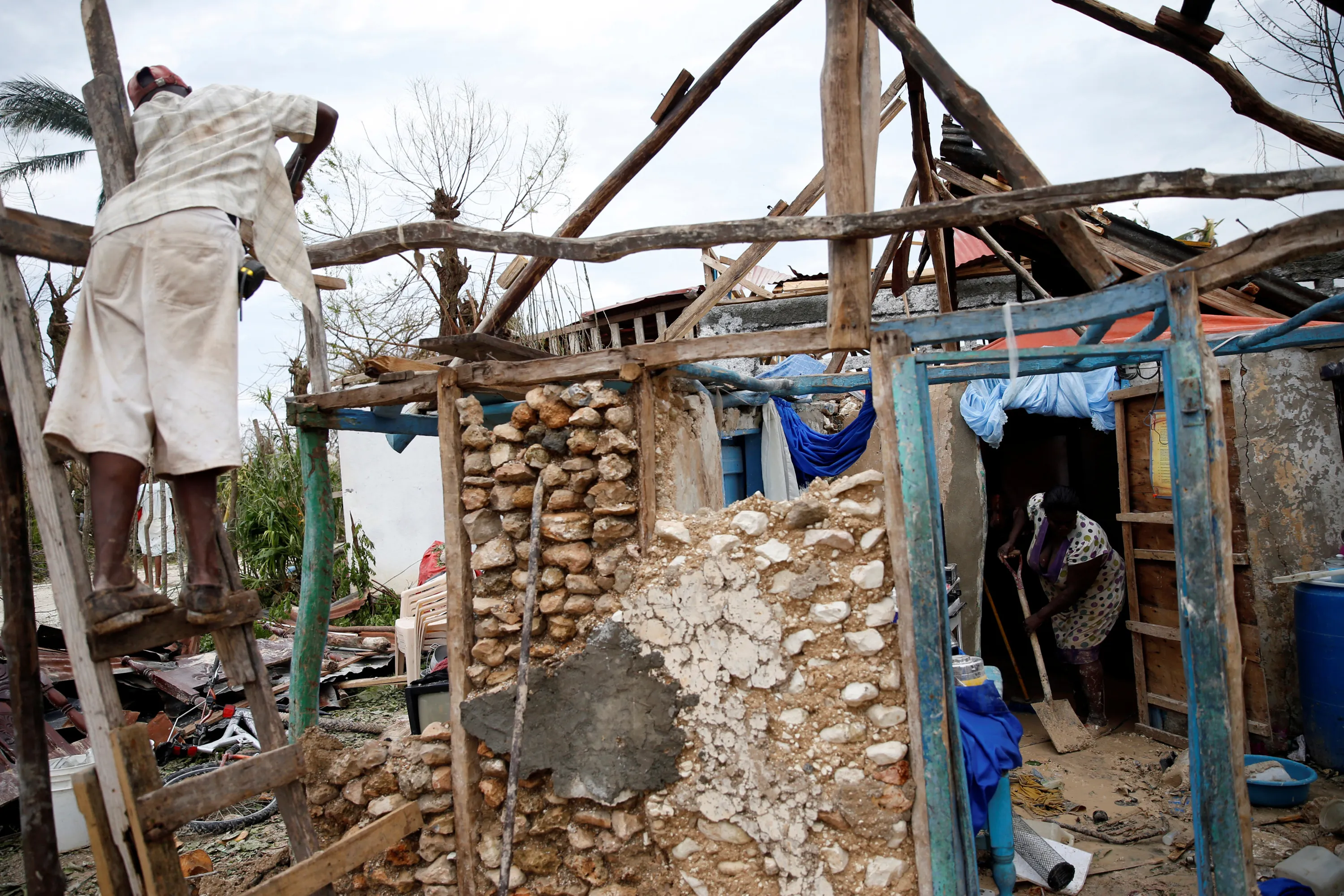 People try to rebuild their destroyed house after Hurricane Matthew passed Jeremie, Haiti, October 6, 2016. (Photo by Carlos Garcia Rawlins/Reuters)