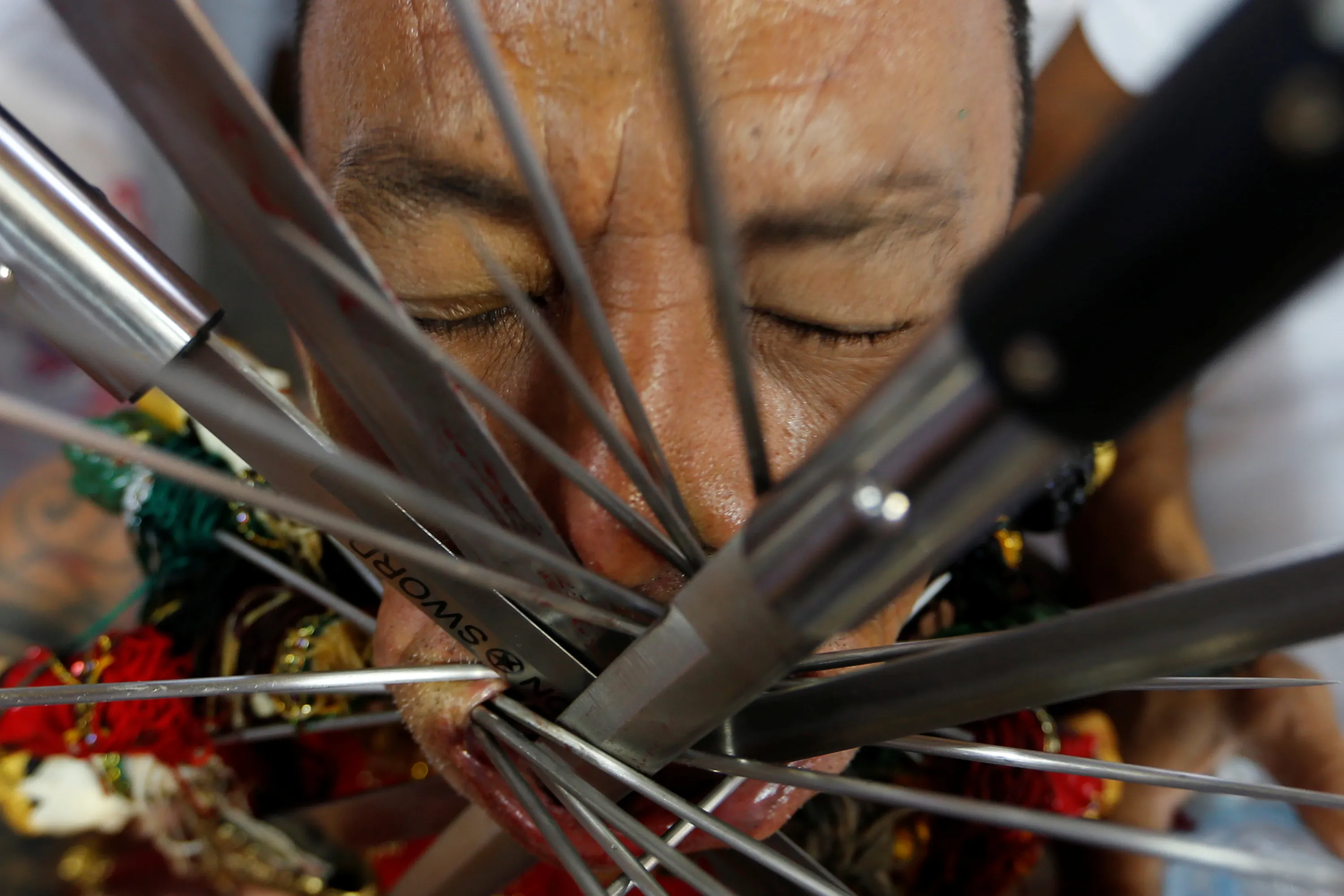 A devotee of the Chinese Bang Neow shrine with his face pierced with spikes takes part in a procession celebrating the annual vegetarian festival in Phuket, Thailand October 6, 2016. (Photo by Jorge Silva/Reuters)