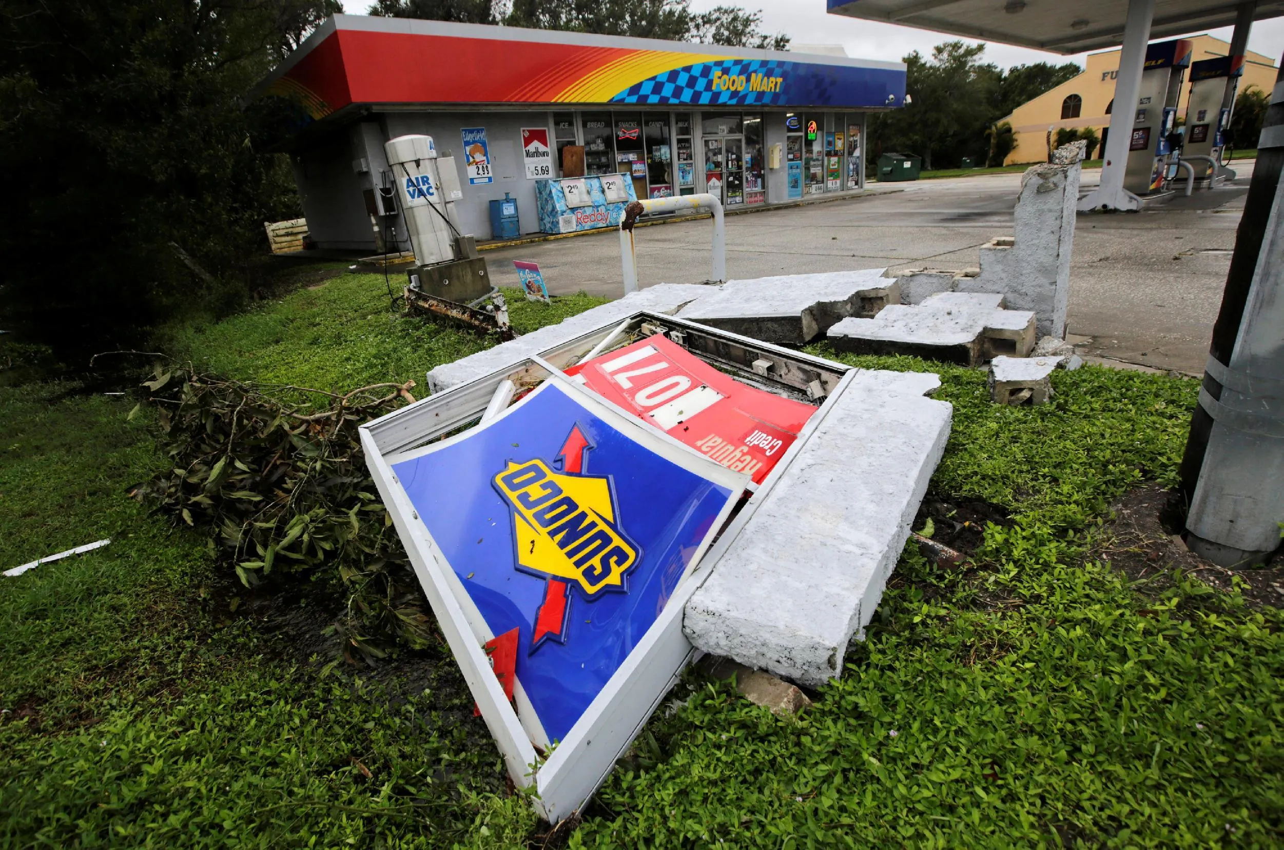 A sign of a Sunoco gas station, damaged by Hurricane Matthew, is seen in Melbourne, Florida, U.S. October 7, 2016. (Photo by Henry Romero/Reuters)