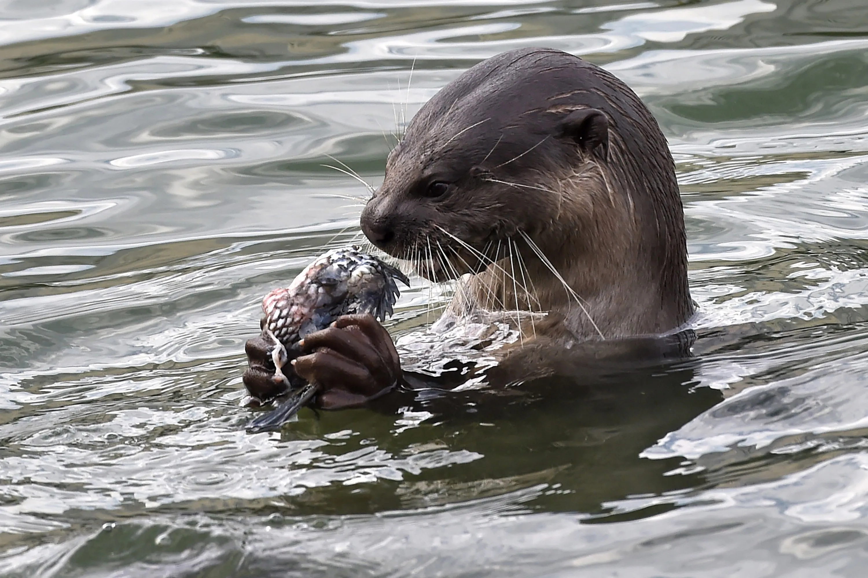 A wild otter feeds on fish at Marina bay reservoir in Singapore on October 3, 2016. Smooth-coated otters are commonly spotted in reservoirs and some parks and there some 50 otters estimated in Singapore. (Photo by Roslan Rahman/AFP Photo)