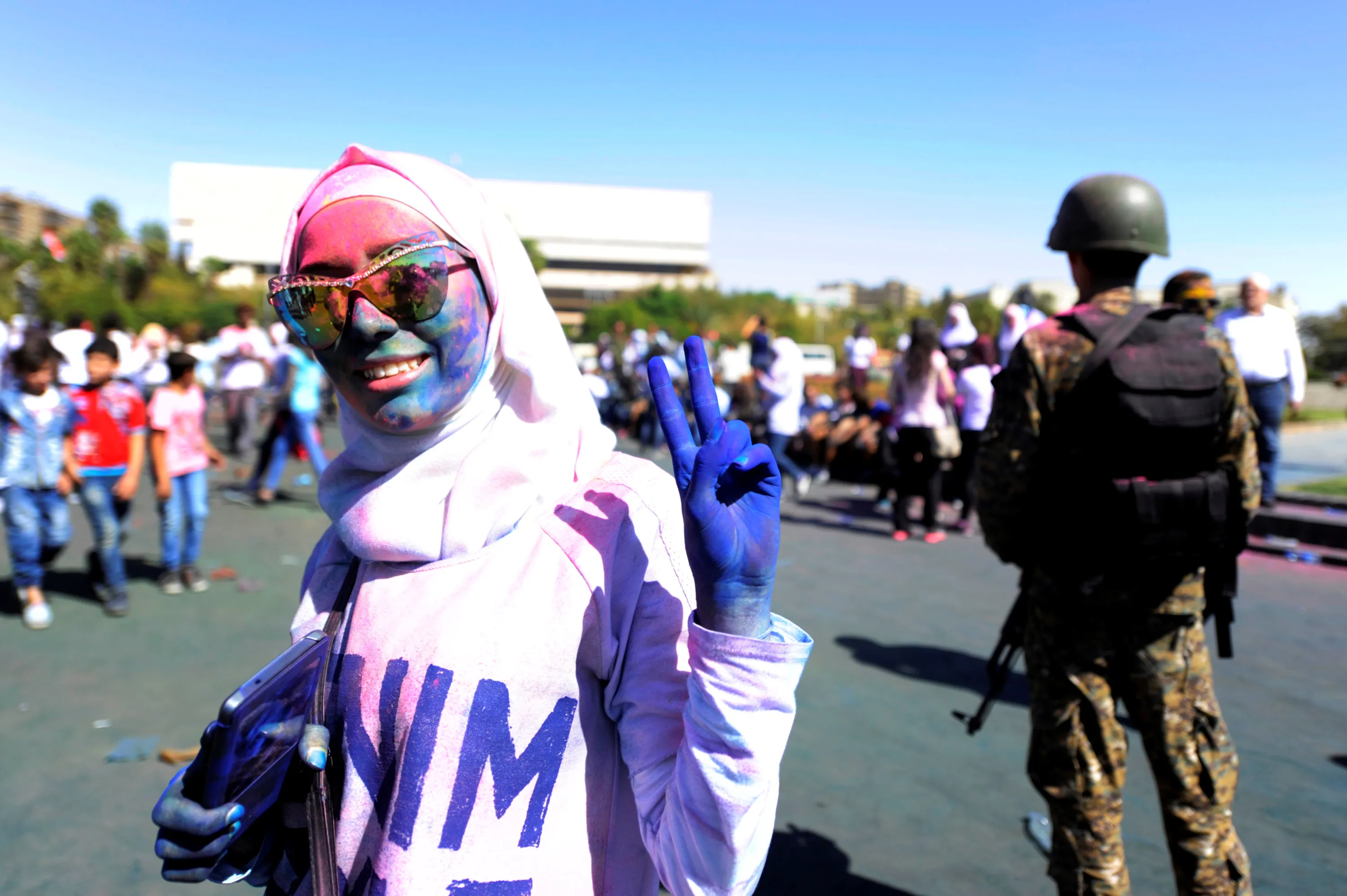 A participant covered in coloured powder gestures as she stands near a Syrian army soldier during “I Love Damascus” marathon at Umayyad Square in Damascus, Syria October 7, 2016. (Photo by Omar Sanadiki/Reuters)
