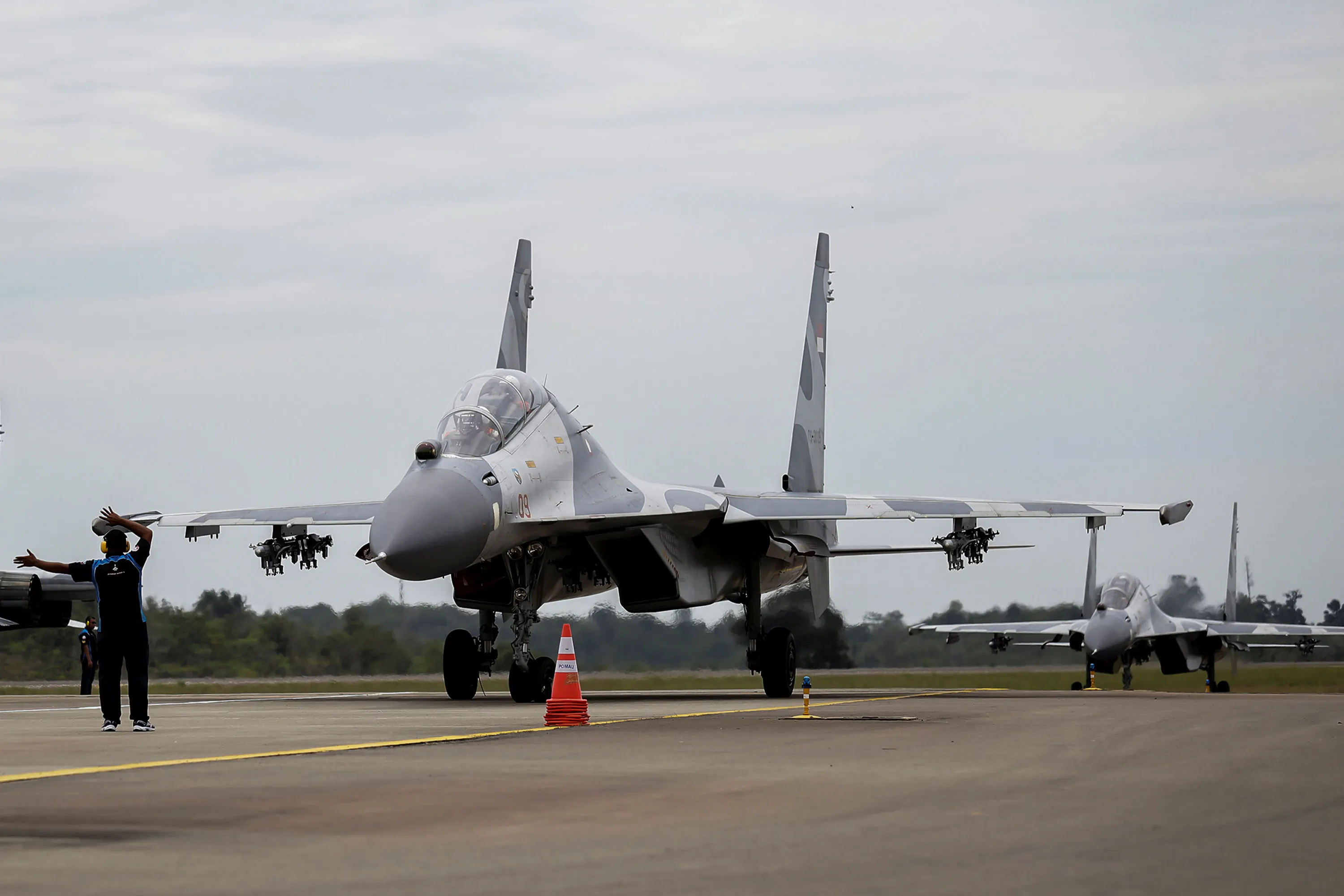 Indonesian Air Force Sukhoi fighter jets land after training for an upcoming military exercise at Hang Nadim Airport, Batam, Riau Islands, Indonesia October 3, 2016. (Photo by M.N. Kanwa/Reuters/Antara Foto)