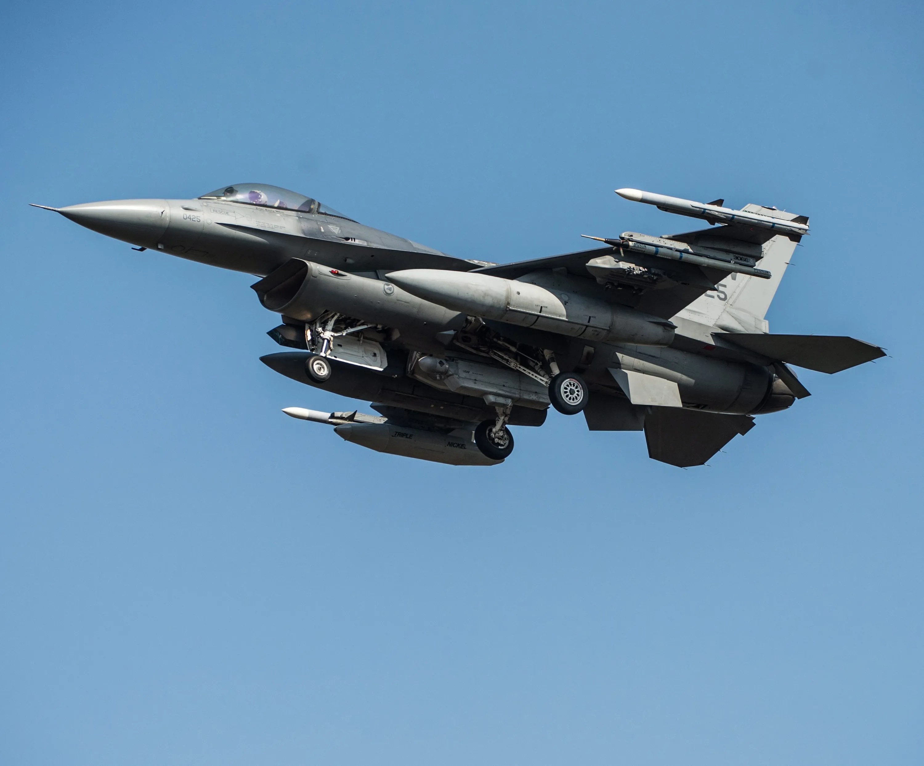 A US F-16 fighter jet in the Polish air space prepares to land at the 32 Tactical Air Base in Lask, central Poland, 14 March 2014. (Photo by Grzegorz Michalowski/EPA)