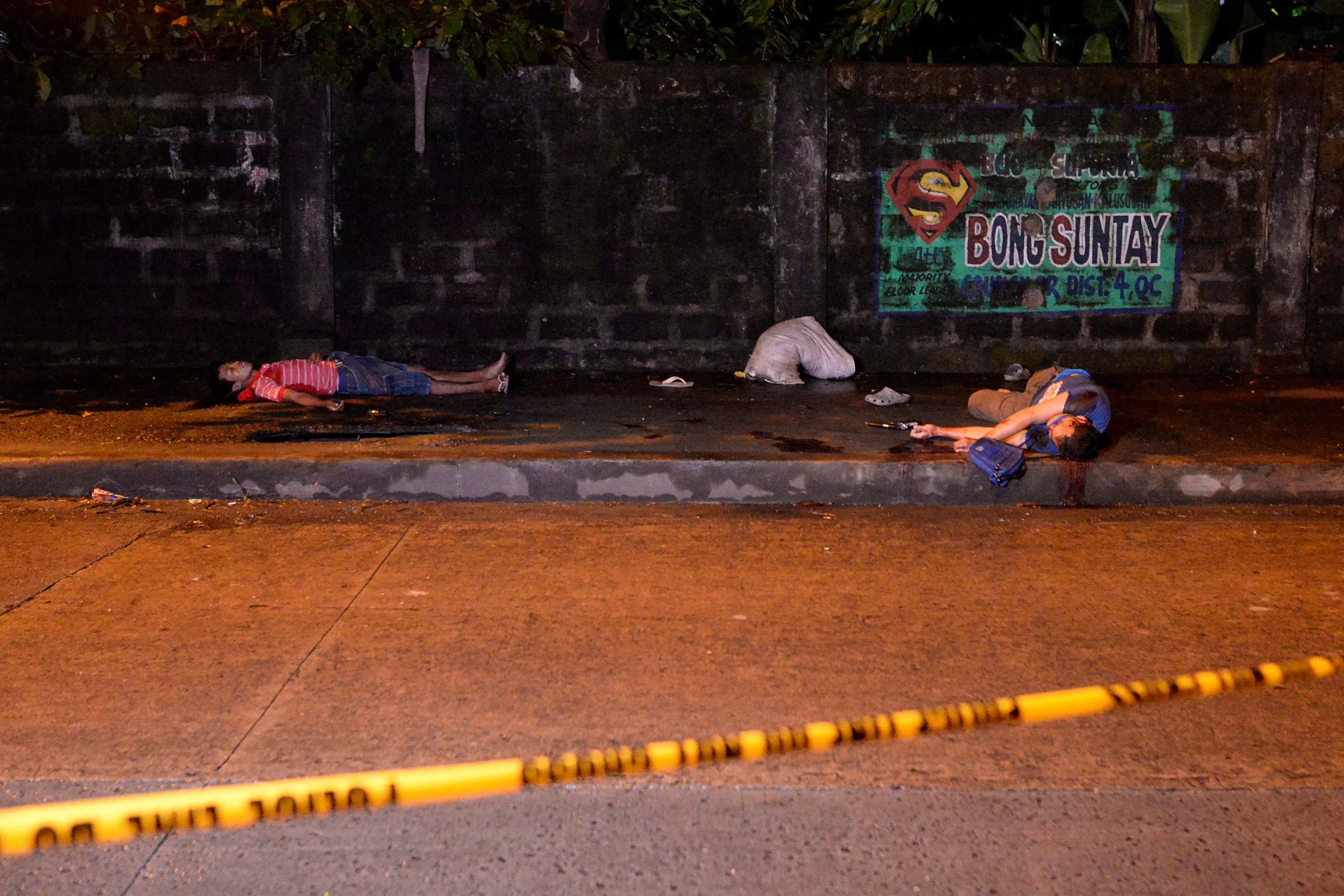 The bodies of two men, who police said were killed after a drug “Shabu” (Metamphetamine Chloride) buy-bust operation, lie on a sidewalk with revolvers near their hands in Quezon city, Metro Manila, Philippines, October 9, 2016. (Photo by Ezra Acayan/Reuters)