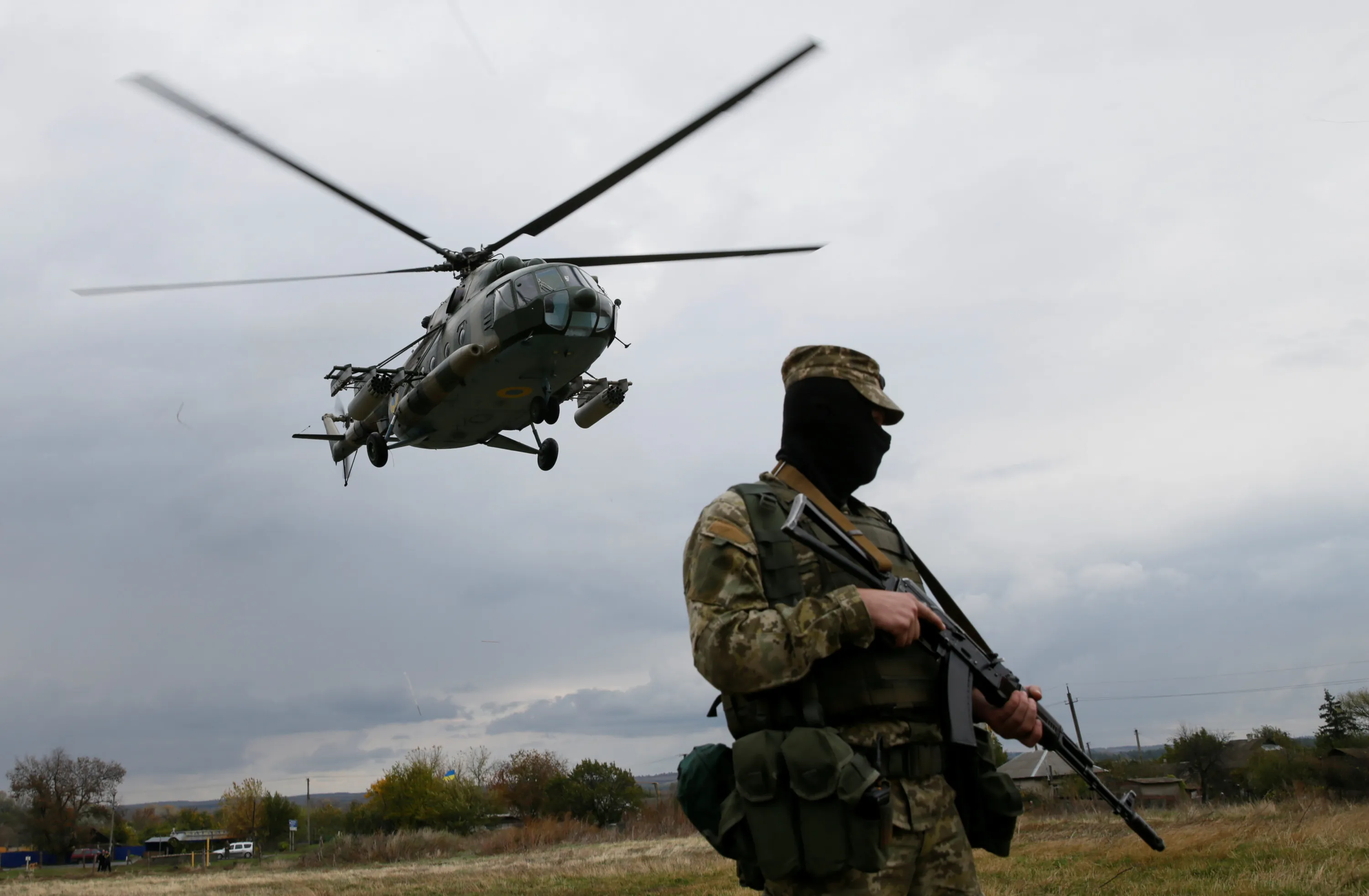 A member of Ukrainian armed forces stands guard while a military helicopter takes off near the town Novoaidar in Luhansk Region, Ukraine, October 9, 2016. (Photo by Valentyn Ogirenko/Reuters)