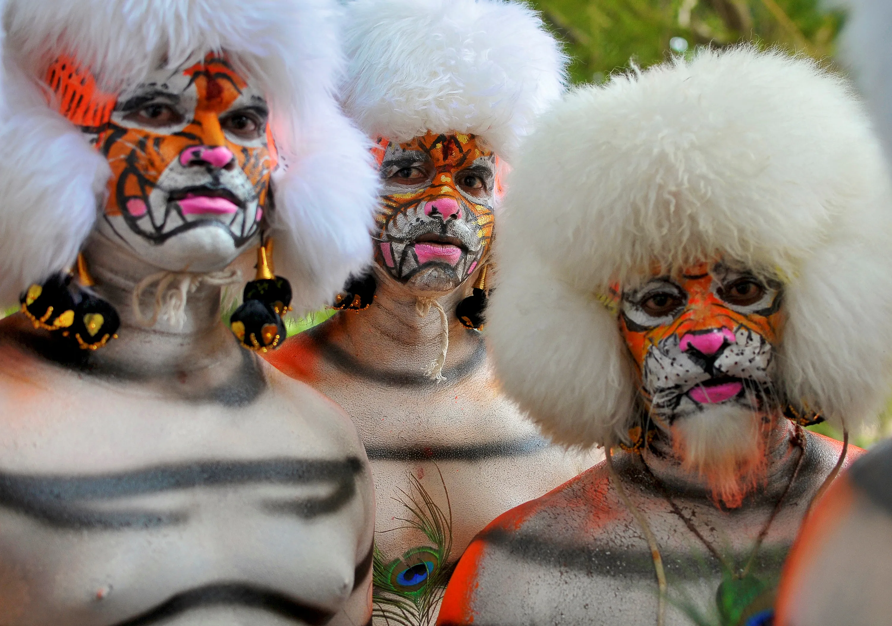 Men dressed as tigers wait to perform during celebrations to mark the Navratri festival, during which devotees worship the Hindu goddess Durga, in Mangaluru, India, October 10, 2016. (Photo by Abhishek N. Chinnappa/Reuters)