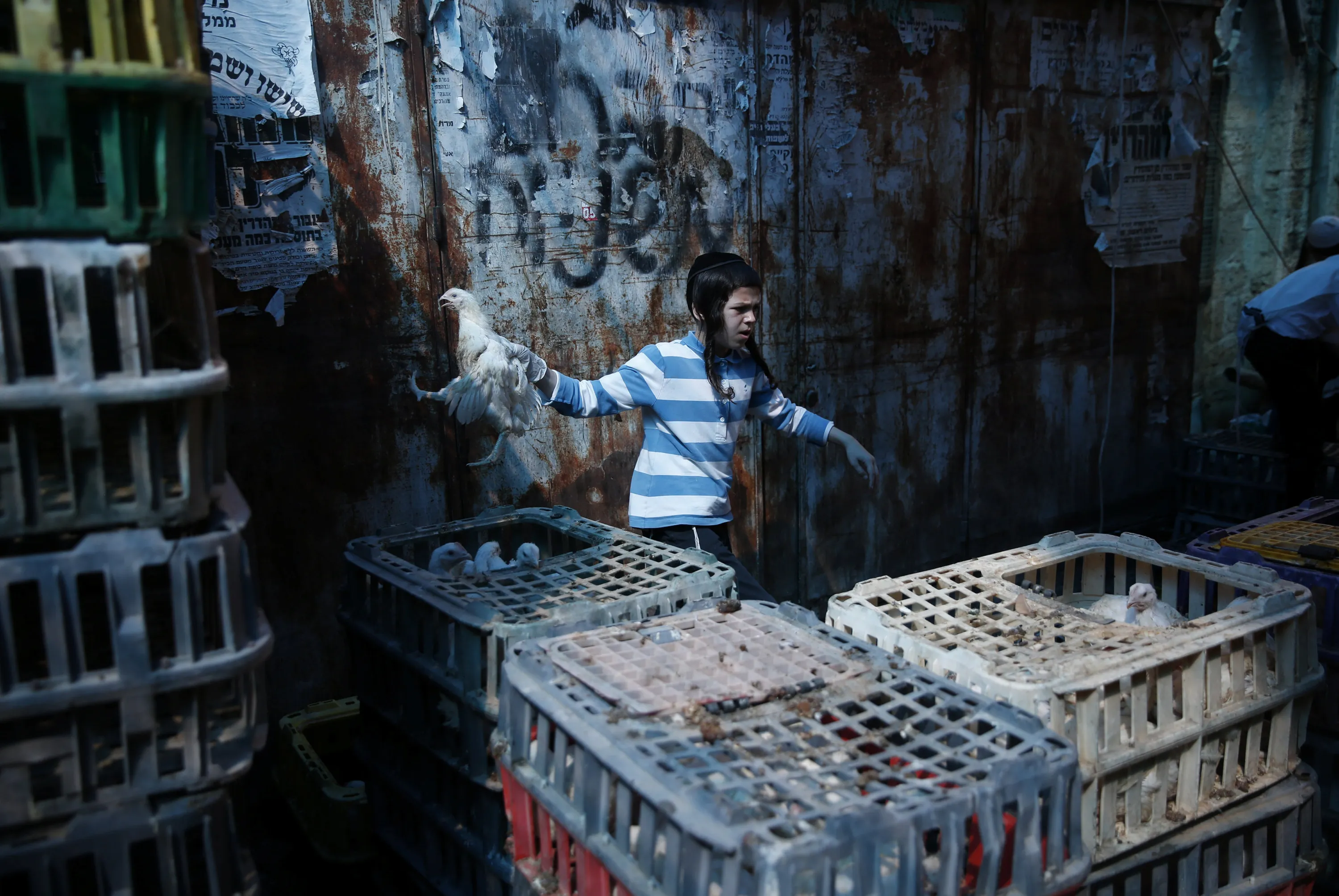 An ultra-Orthodox Jewish youth holds a chicken as others perform the Kaparot ritual, where white chickens are slaughtered as a symbolic gesture of atonement, in Jerusalem's Mea Shearim neighbourhood October 10, 2016, ahead of Yom Kippur, the Jewish Day of Atonement, which starts at sundown on Tuesday. (Photo by Ronen Zvulun/Reuters)