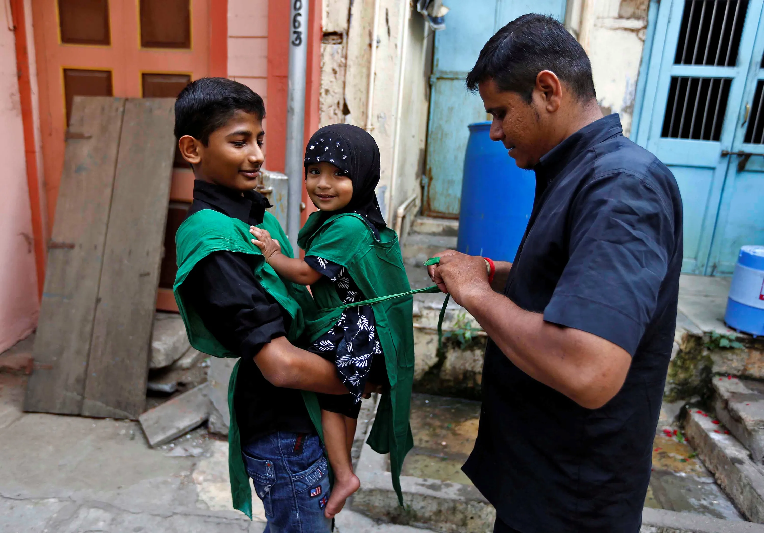 A man ties a holy cloth around his daughter as they prepare to take part in a Muharram procession in Ahmedabad, India, October 10, 2016. (Photo by Amit Dave/Reuters)