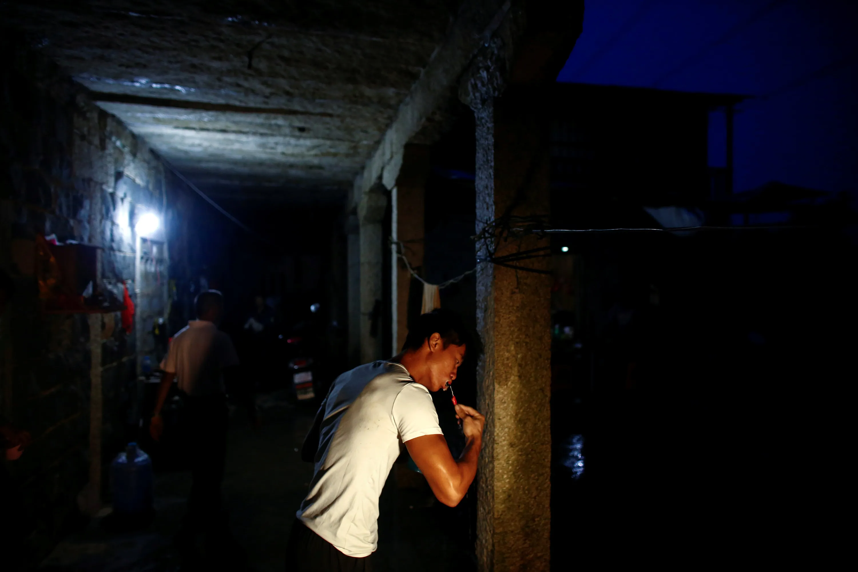 Worker Shi Shenwei brushes his teeth in the yard of an old farm house that serves as dormitory for workers of a nearby construction site of a Buddhist temple in the village of Huangshan, near Quanzhou, Fujian Province, China, September 28, 2016. (Photo by Thomas Peter/Reuters)