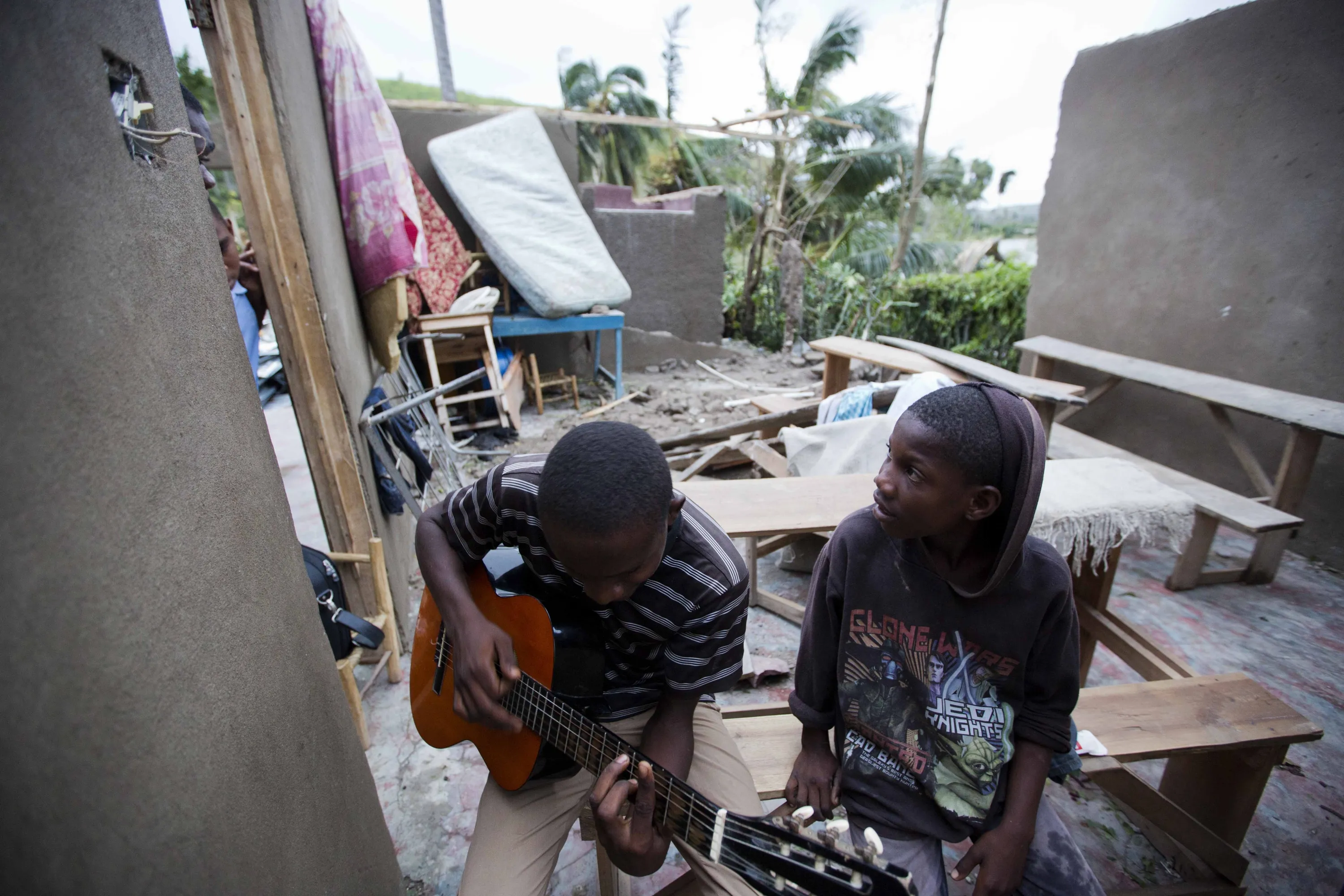 A man sits inside of what is left of his home with his cousin after it was damaged by Hurricane Matthew in Saint-Louis, Haiti, Wednesday, October 5, 2016. (Photo by Dieu Nalio Chery/AP Photo)