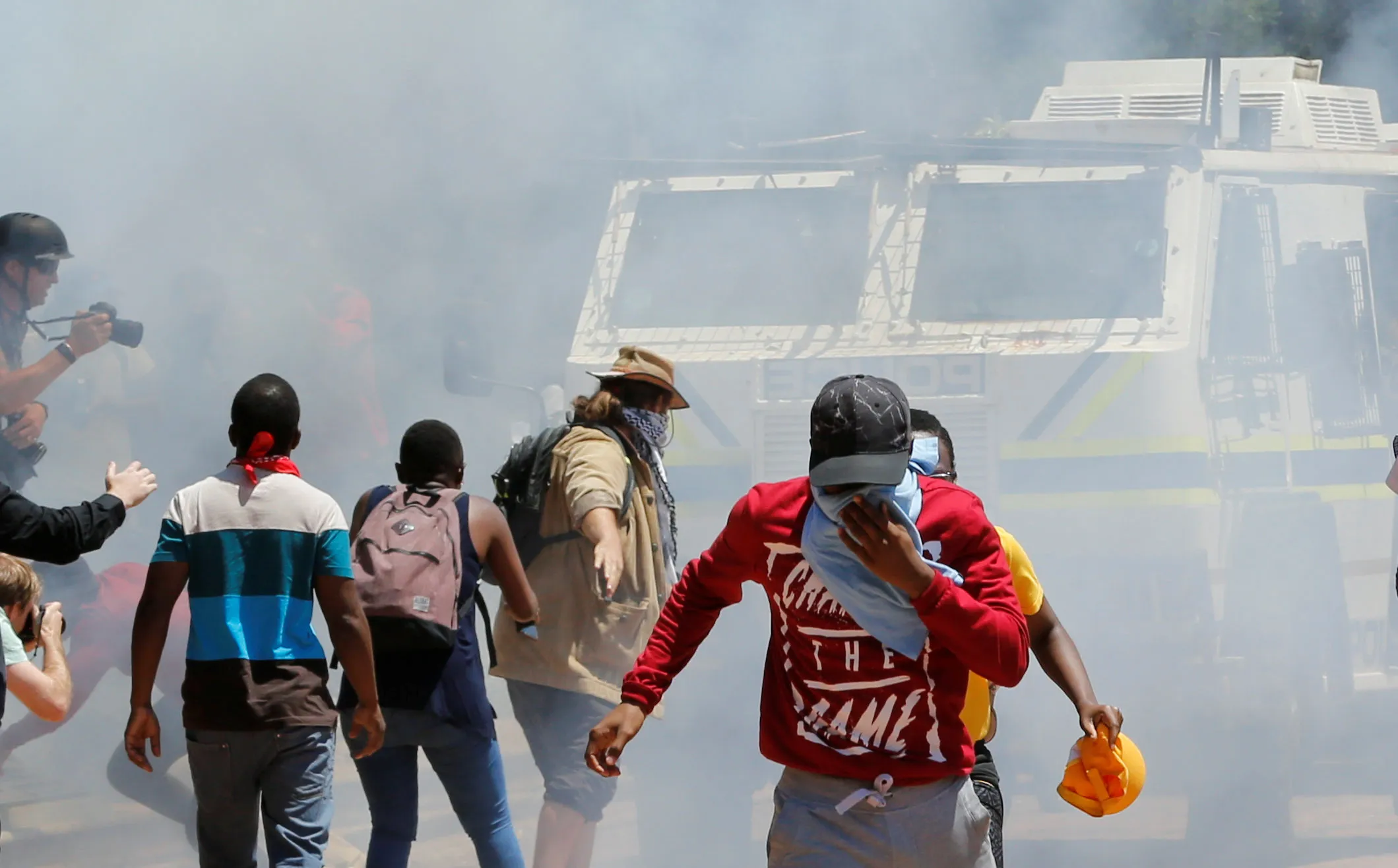Demonstrators run away from a police Nyala vehicle during student protests demanding free education at the Johannesburg's University of the Witwatersrand, South Africa, October 10,2016. (Photo by Siphiwe Sibeko/Reuters)