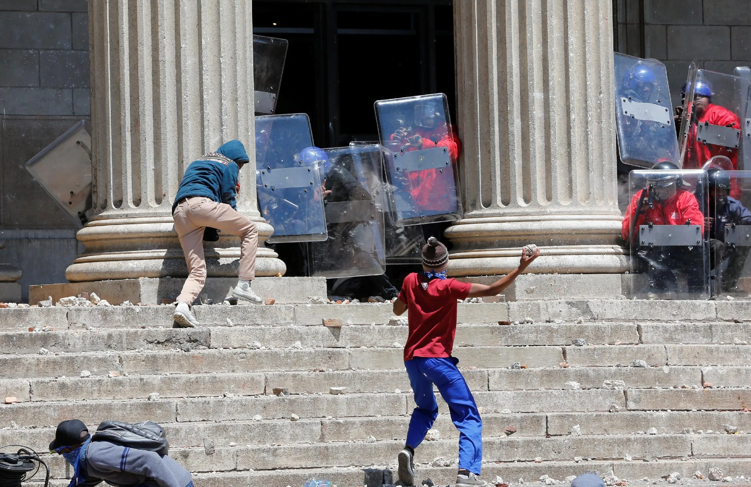 A demonstrator hurls rocks at shield-wielding private security guards during student protests demanding free education at the Johannesburg's University of the Witwatersrand, South Africa, October 10,2016. (Photo by Siphiwe Sibeko/Reuters)