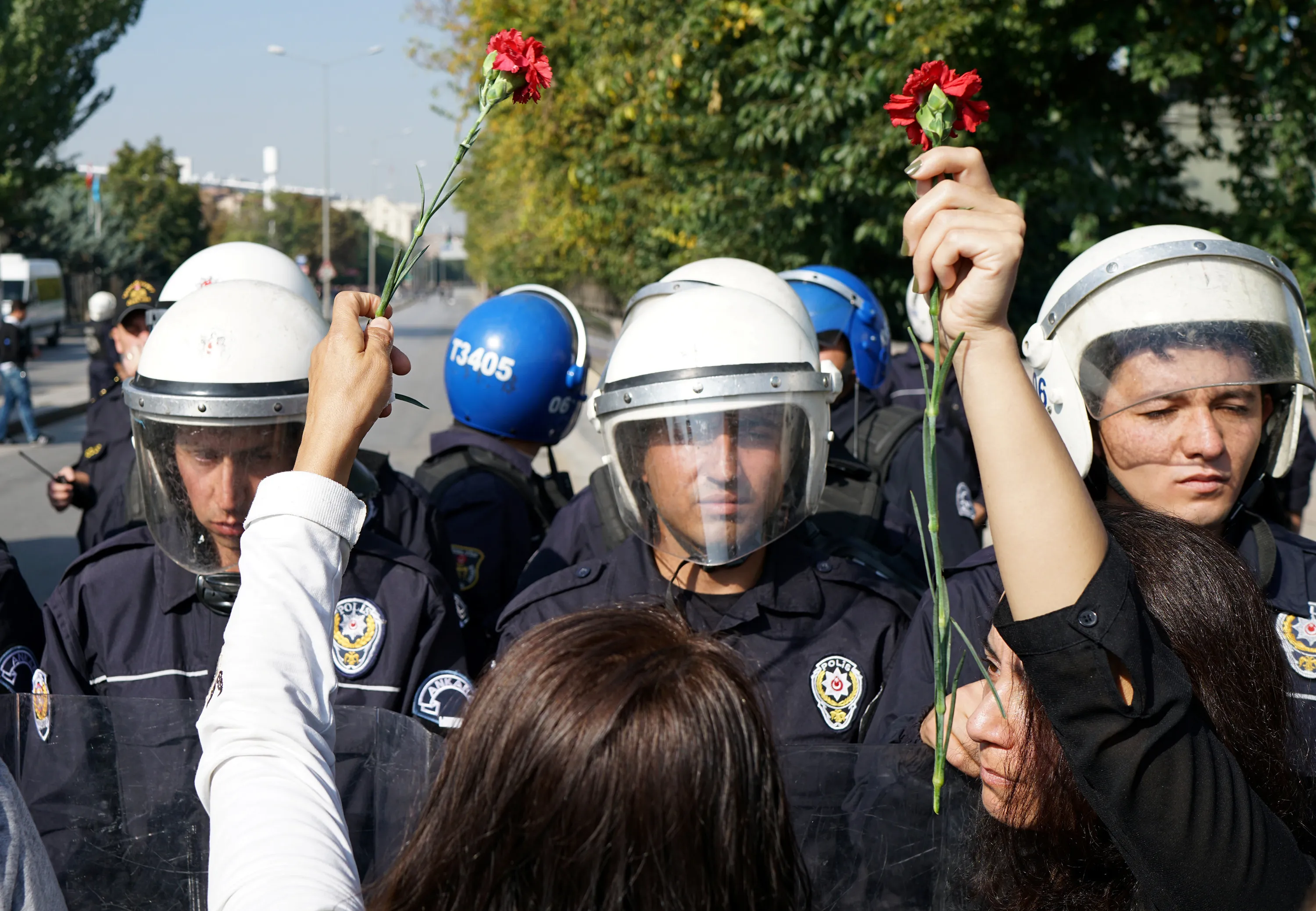 Riot police stop women holding carnations as they march to commemorate last year's deadly suicide bombing near the main train station in Ankara, Turkey, October 10, 2016. (Photo by Umit Bektas/Reuters)