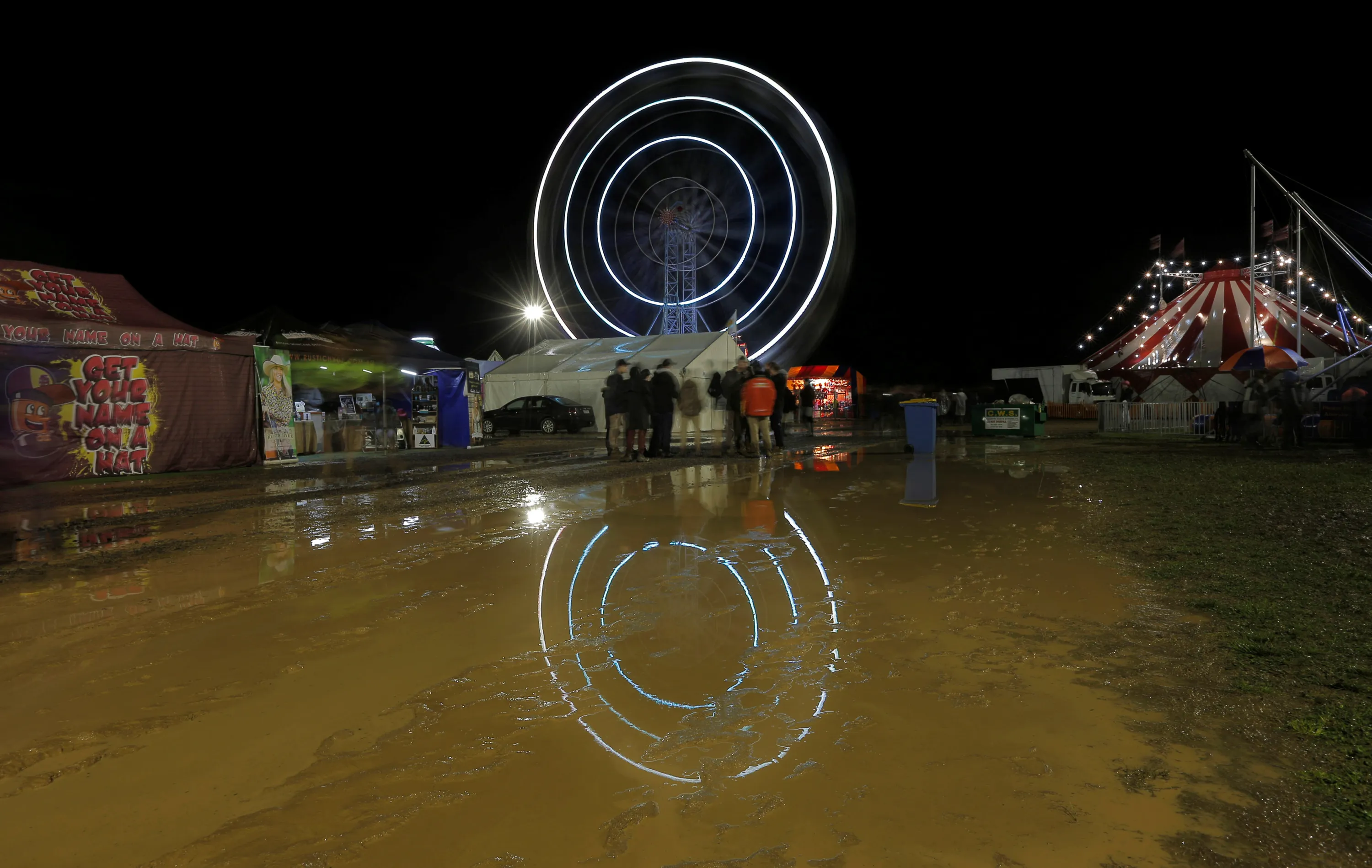 A spinning ferris wheel is reflected in mud after heavy rains flooded the sideshow carnival at the Deni Ute Muster in Deniliquin, New South Wales, Australia, September 30, 2016. (Photo by Jason Reed/Reuters)