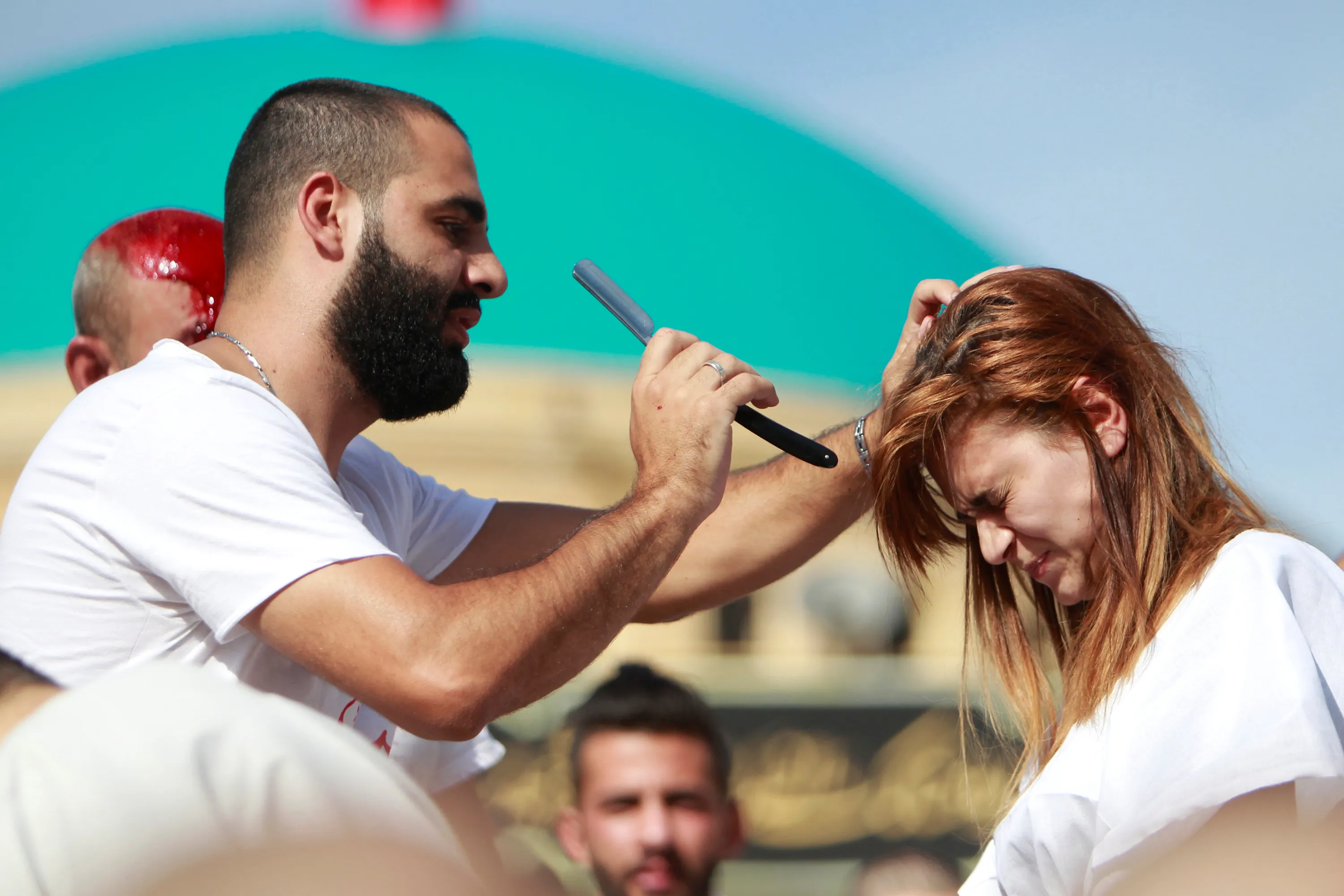 A Shi'ite Muslim attempts to tap the head of a woman with a razor to draw blood during a religious procession to mark Ashura in Nabatiyeh town, southern Lebanon, October 12, 2016. (Photo by Ali Hashisho/Reuters)