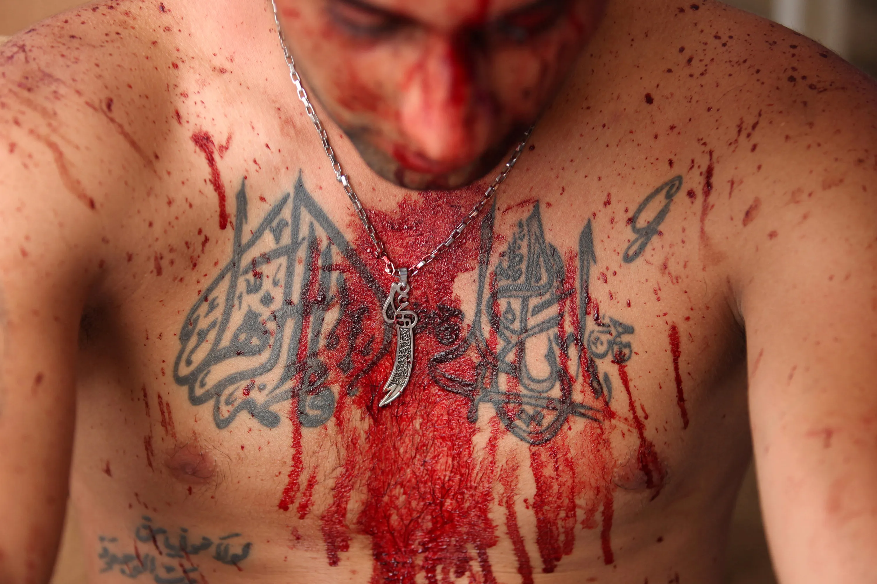 A Shi'ite Muslim man rests after gashing his forehead with a razor during a religious procession to mark Ashura in Nabatiyeh, southern Lebanon October 12, 2016. The tattoo reads in Arabic calligraphy “Ali, Fatima Zahra”. (Photo by Ali Hashisho/Reuters)