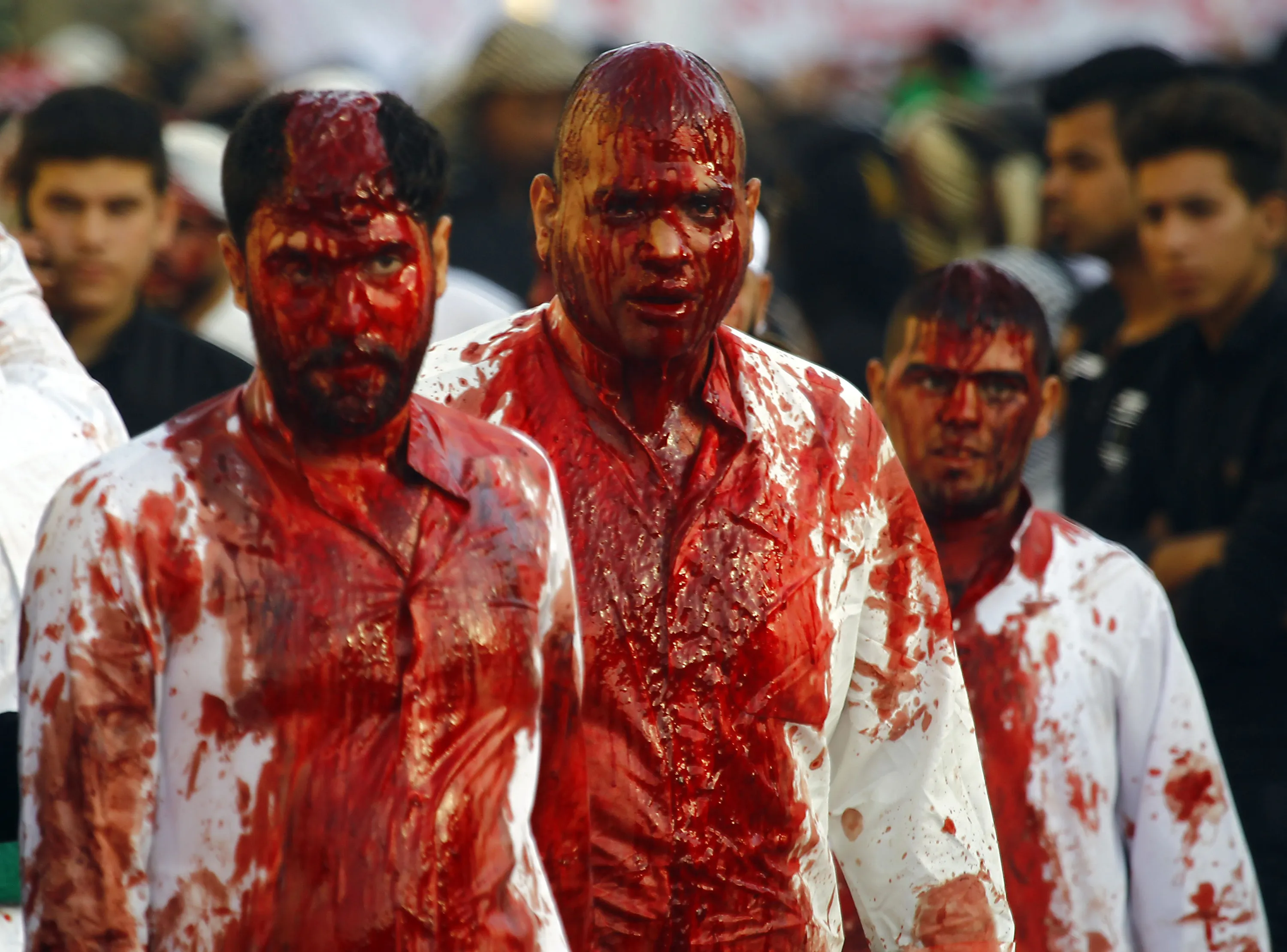 Iraqi Shiite Muslim men are seen after flagellating themselves on the tenth day of the mourning period of Muharram, which marks the day of Ashura, in the holy city of Najaf on October 12, 2016. Ashura mourns the death of Imam Hussein, a grandson of the Prophet Mohammed, who was killed by armies of the Yazid near Karbala in 680 AD. (Photo by Haidar Hamdani/AFP Photo)