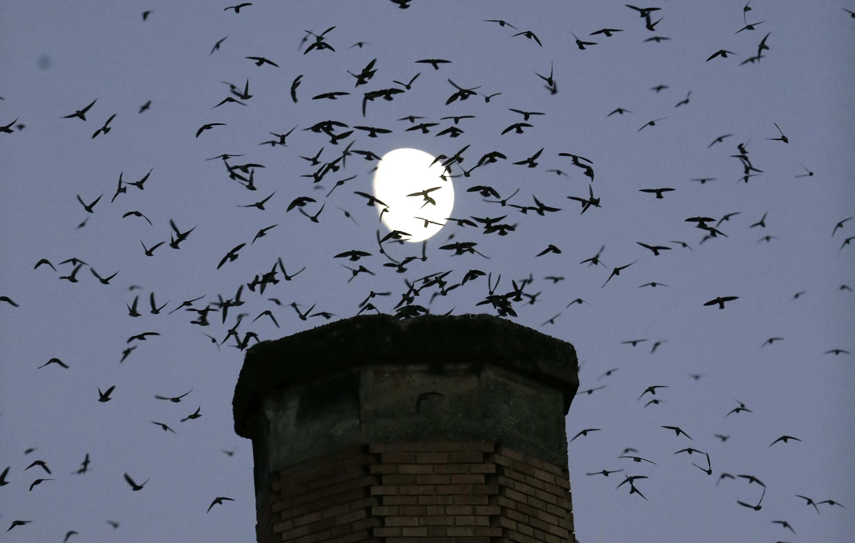 In this Tuesday, September 13, 2016 photo,tThe moon is visible in the background as a multitude of migratory Vaux's Swifts flock to roost for the night inside a large, brick chimney at Chapman Elementary School in Portland, Ore. Numbers of Vaux's Swifts are in decline, in part scientists say because of the destruction of the brick chimneys that they use to roost during their annual fall migration. (Photo by Don Ryan/AP Photo)