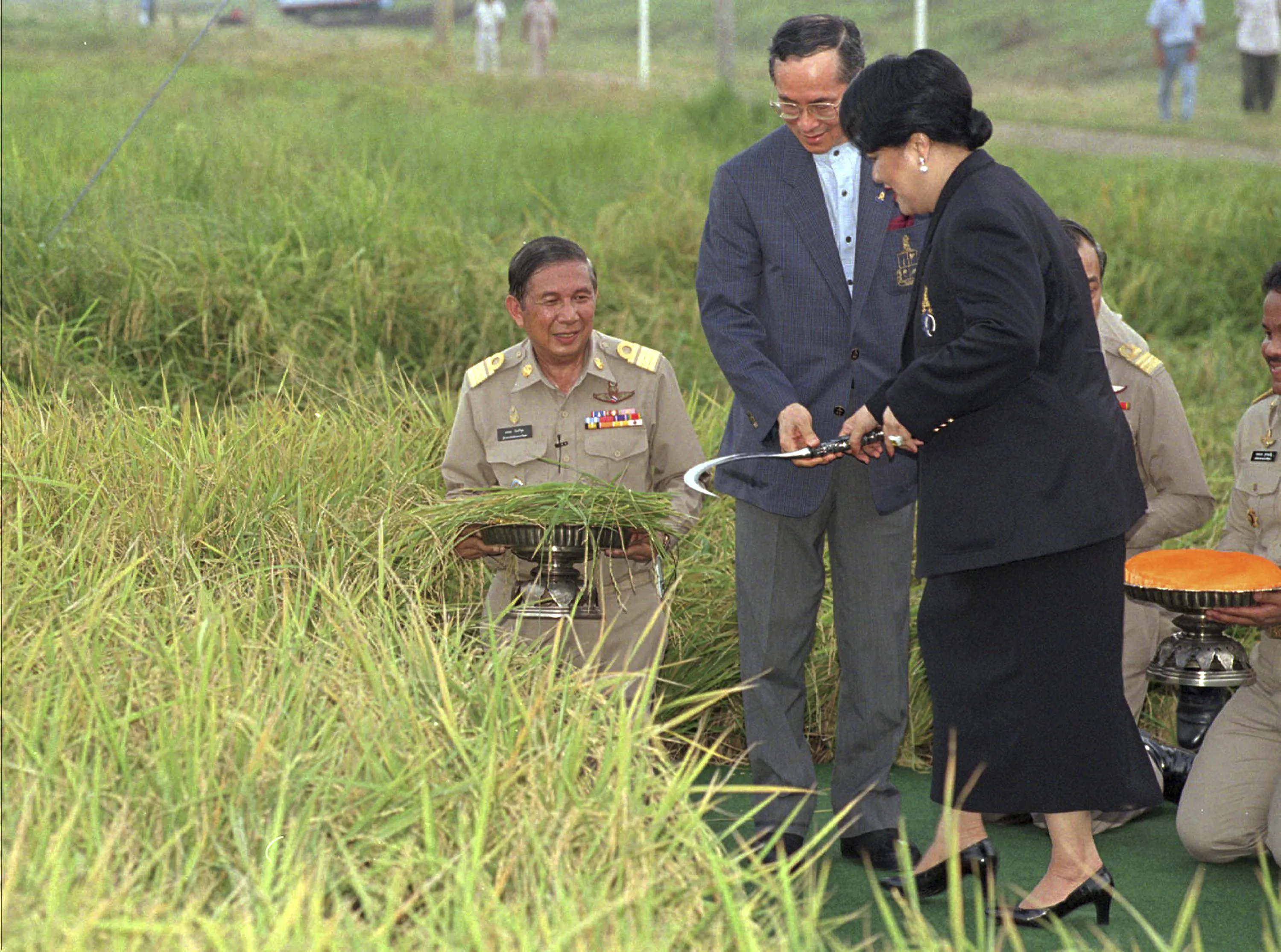 In this May 14, 1996, file photo, Thailand's King Bhumibol Adulyadej and Queen Sirikit hold a sickle during a rice harvesting ceremony in Ayuthaya, 70 km (44 mi) north of Bangkok. (Photo by Charles Dharapak/AP Photo)