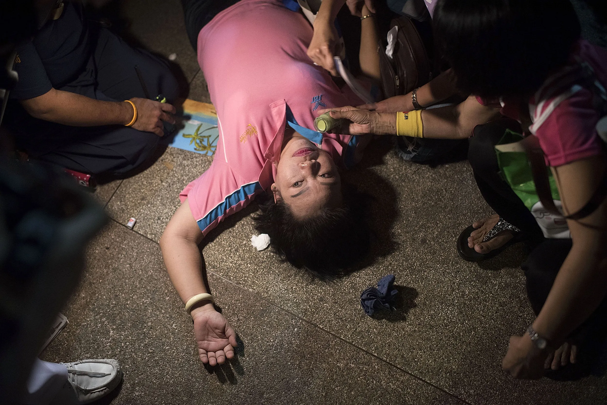 A woman passes out after the official statement announcing the death of Thailand's King Bhumibol Adulyadej on October 13, 2016 in Bangkok, Thailand. King Bhumibol, the world's longest reigning monarch, died at 88 in Bangkok's Siriraj Hospital on Thursday. (Photo by Borja Sanchez Trillo/Getty Images)