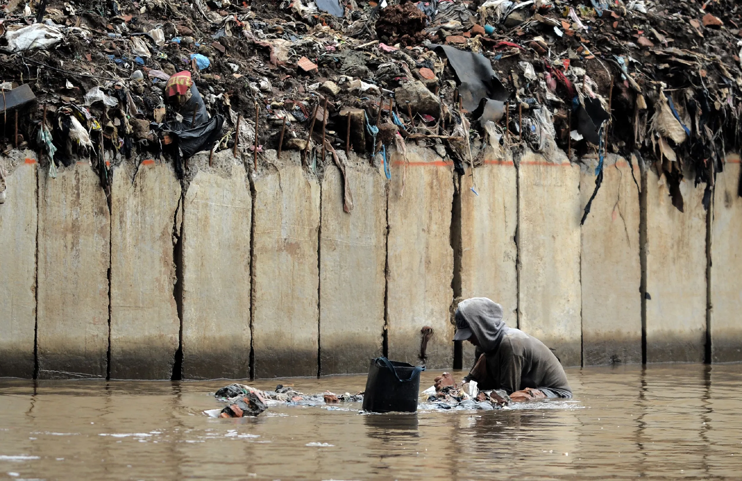 A man grops the riverbed as he searches for valuable goods to resale in Jakarta, on October 13, 2016. Indonesia's public debt to gross domestic product (GDP) ratio stood at 33.05 percent at the end of 2015, according to the World Bank. (Photo by Bay Ismoyo/AFP Photo)