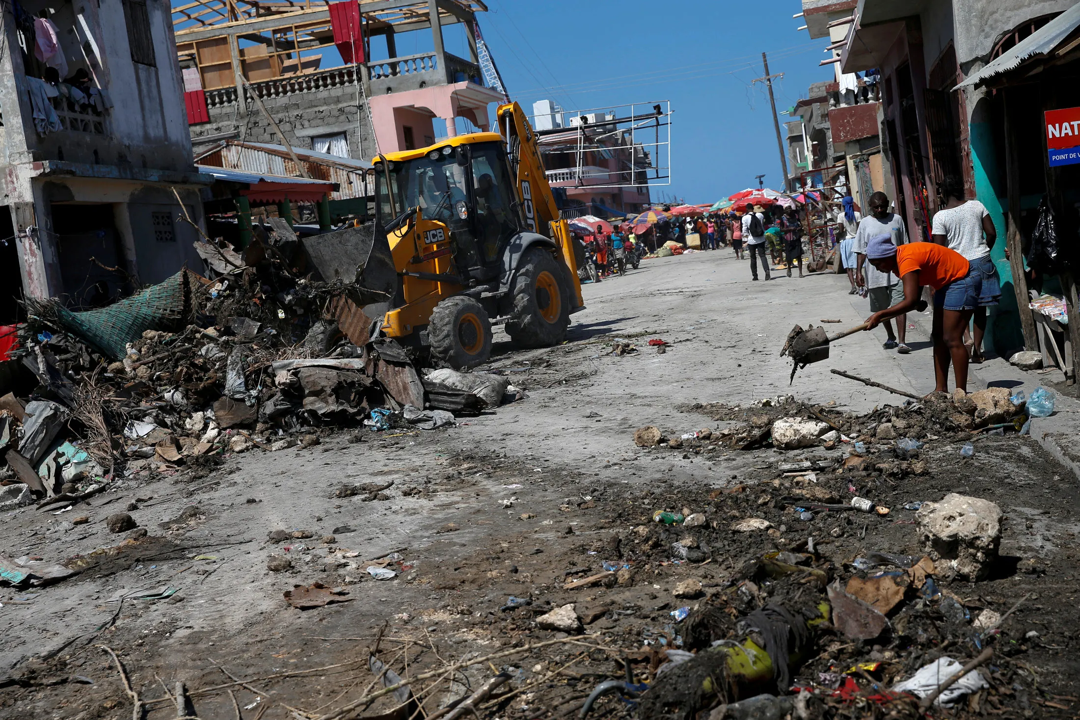 Workers use a bulldozer to clean the street after Hurricane Matthew hit Jeremie, Haiti, October 12, 2016. (Photo by Carlos Garcia Rawlins/Reuters)