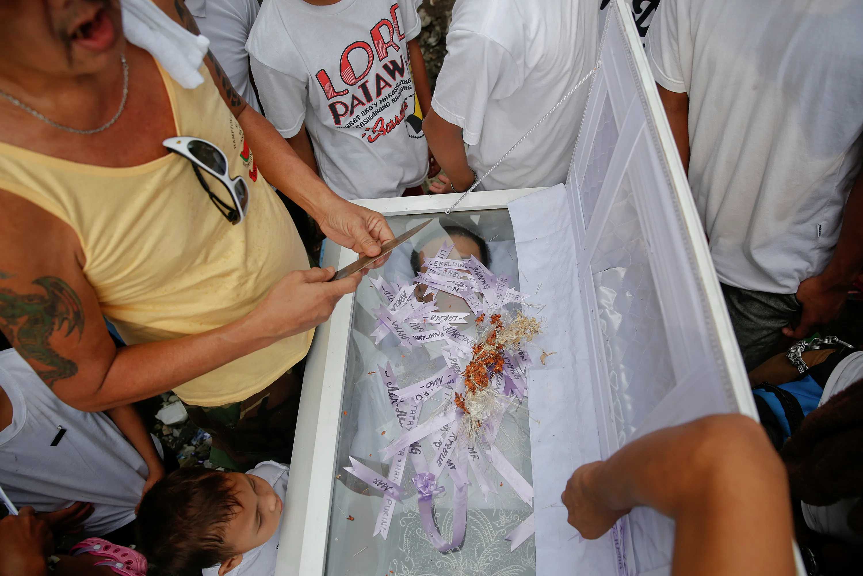 Friends and relatives of Gilbert Purgatorio, who was killed by masked gunmen, mourn around the coffin during his and his relative's funeral at a cemetery in Manila, Philippines October 11, 2016. (Photo by Damir Sagolj/Reuters)