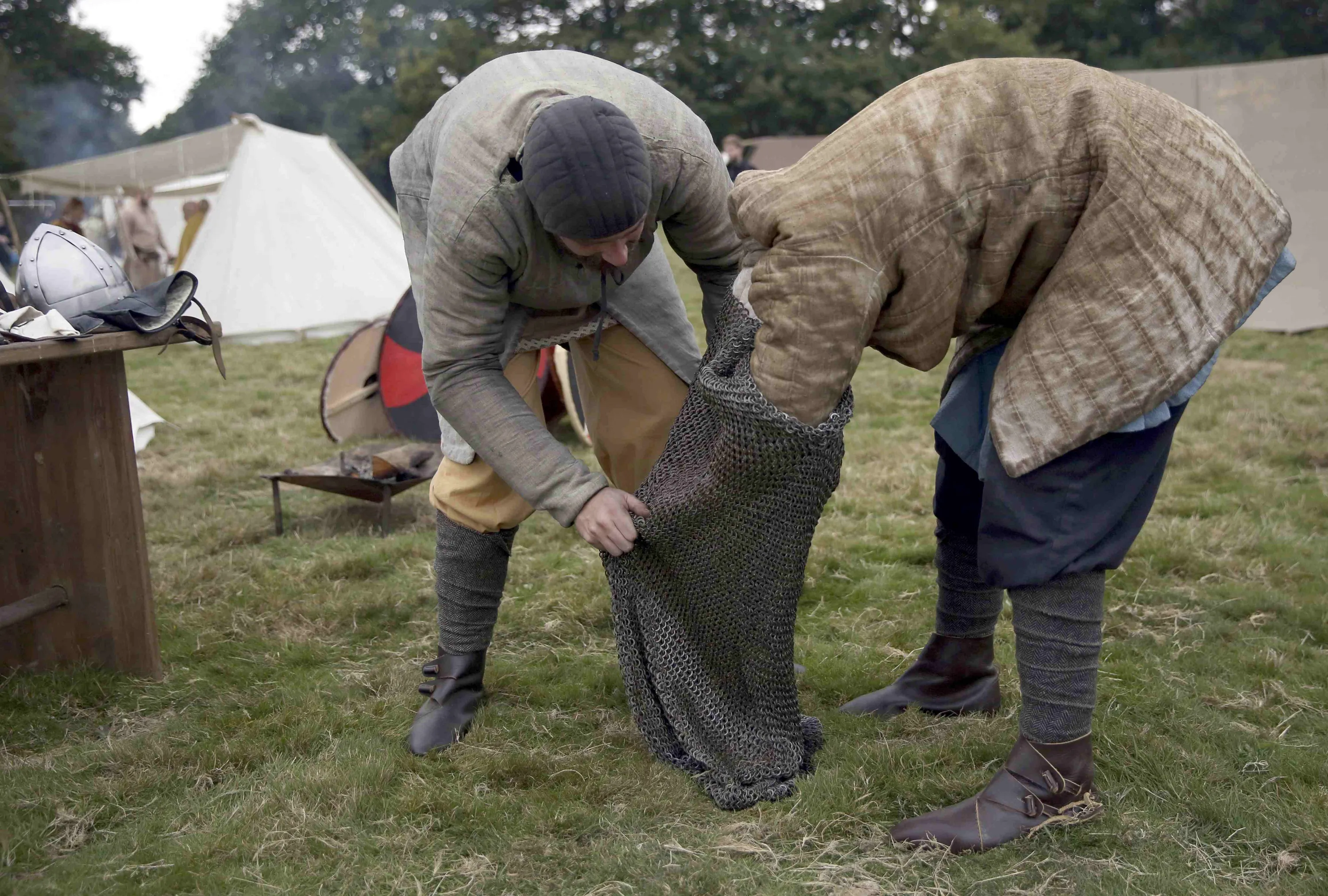 Re-enactors dress before a re-enactment of the Battle of Hastings, commemorating the 950th anniversary of the battle, in Battle, Britain October 15, 2016. (Photo by Neil Hall/Reuters)