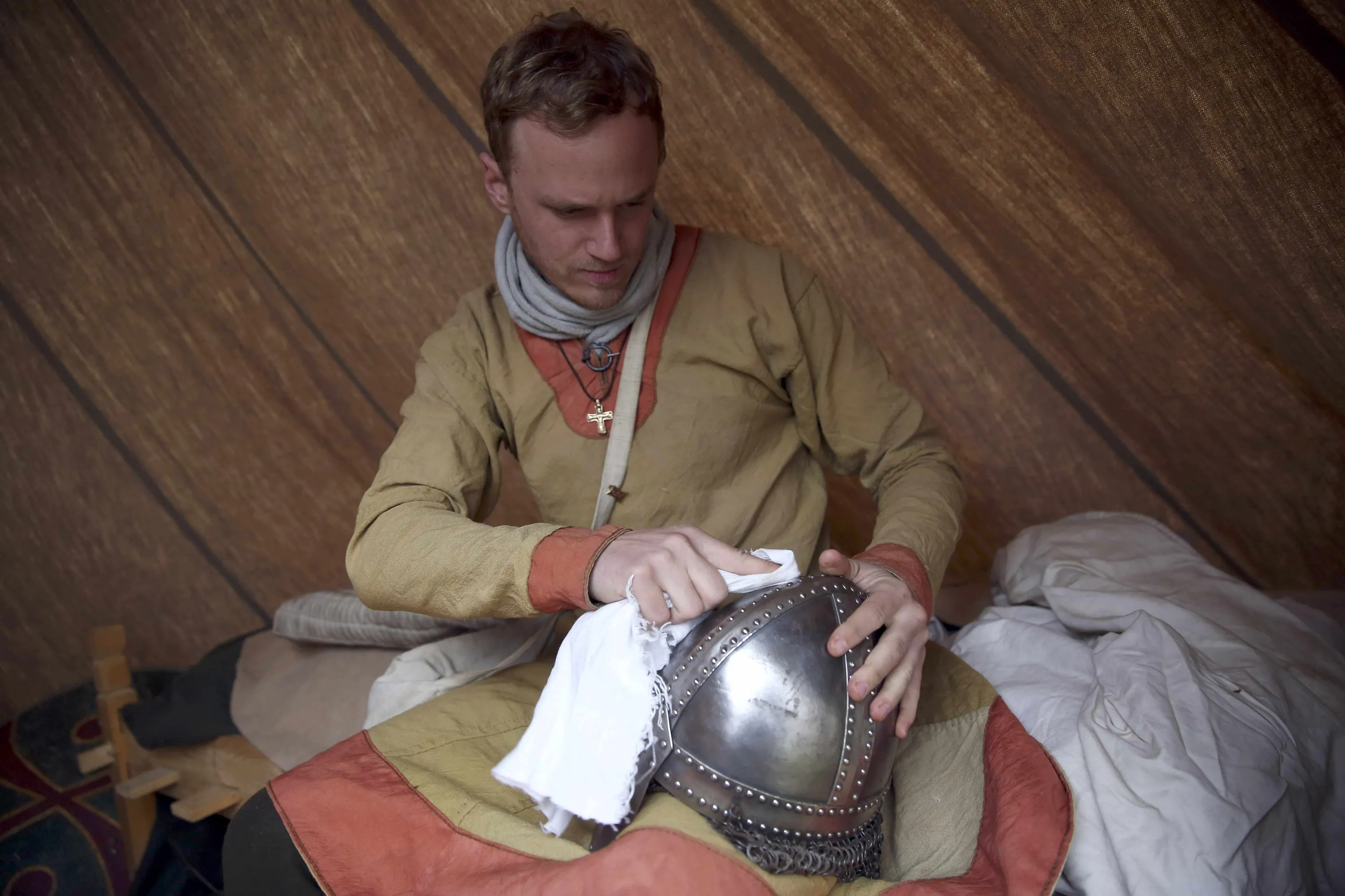 A re-enactor polishes his armour before a re-enactment of the Battle of Hastings, commemorating the 950th anniversary of the battle, in Battle, Britain October 15, 2016. (Photo by Neil Hall/Reuters)