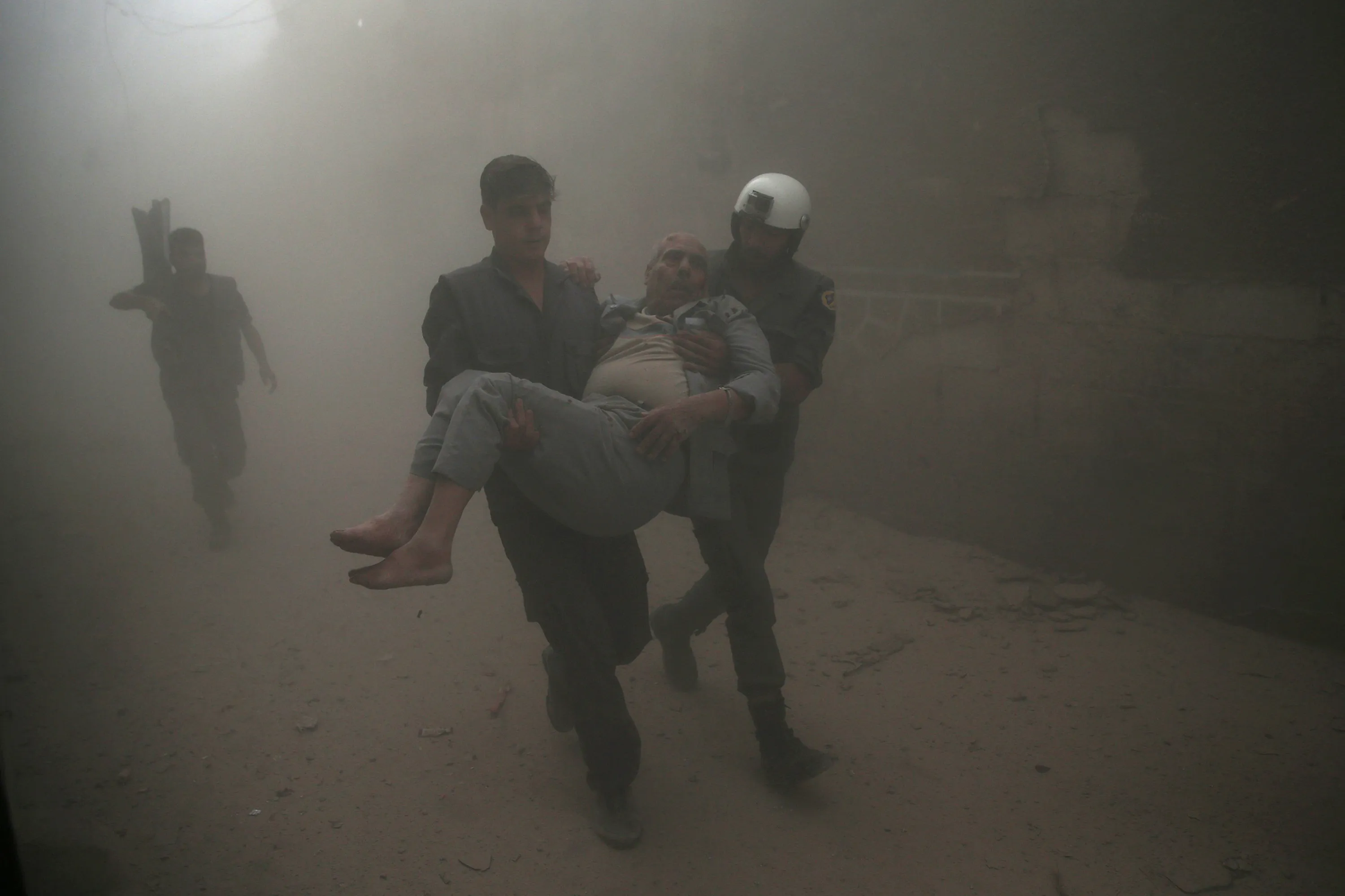 Civil defense members carry an injured man after an air strike in the rebel-held Douma neighbourhood of Damascus, Syria October 12, 2016. (Photo by Bassam Khabieh/Reuters)